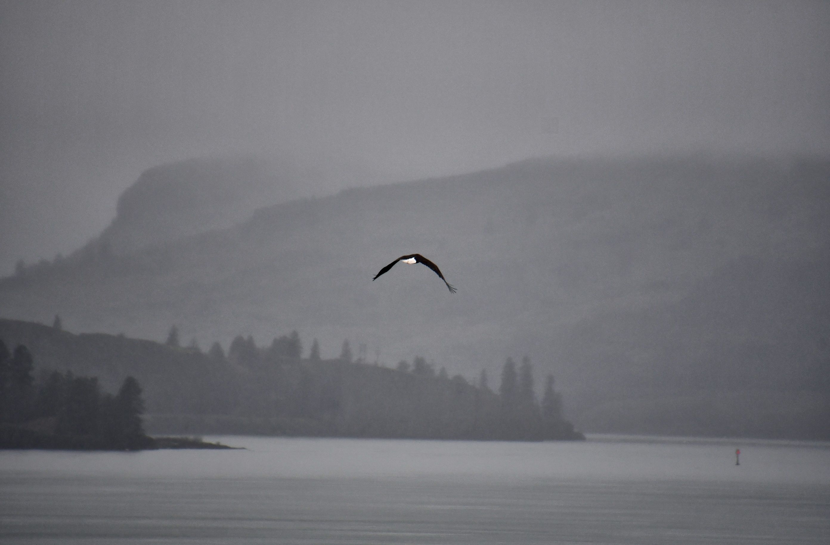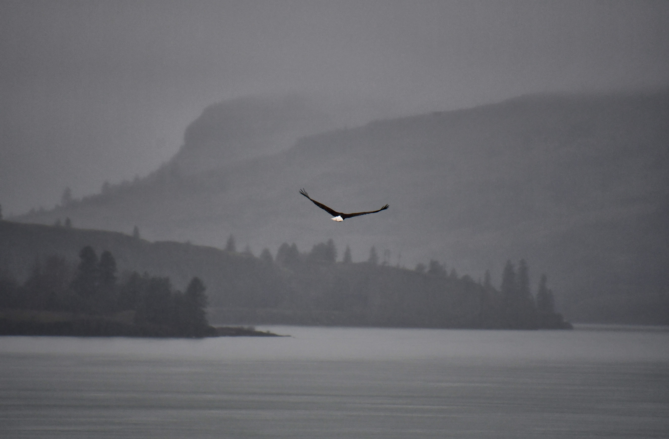 You know, you noticed the exact thing, Marlene. The weather was so awful I drove down the highway a ways before I told myself PULL OVER! I really didn’t want to get out of my car. Then I was so far down the road I had such a run to get back to the birds. Luckily, there is a rock berm beside the highway there the entire distance, so I ran until I came to the edge of it, peeped around, and took the three shots of them in the tree. I ducked behind the hill again, checked to make sure my camera was all set right, then peeped around once more and they were gone! I scanned the skies and found them flying away, and got three more shots before they were too far into the rain. I am so lucky that each one of turned out. And then, bonus, the bad weather makes the background of these shots look amazing, when they are heading down the river.