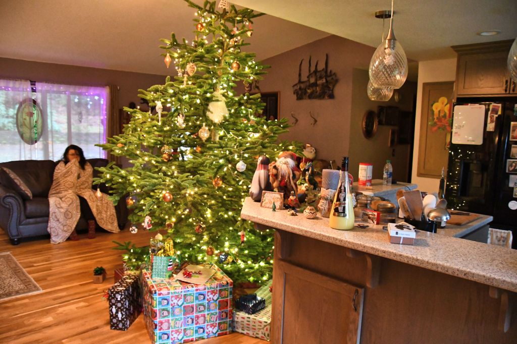 I call it a wonky tree because it has two tops. You can see in the naked tree pic, where two tree trunks rise to the top. The main trunk has a curve where a previous extra trunk was cut off years earlier. Also, it’s gorgeous and bushy in the middle, but the branches are short at the bottom. It’s a pear-shaped tree. There was one particularly big hole at the bottom, created because there were no branches at all. Fortunately, I knew Pedro had one gigantic wrapped gift for me at his house. I asked him to bring it over and I plugged the hole. You can see the giant gift (with Charlie Brown wrapping paper) on the right hand side of the tree in the photo above.