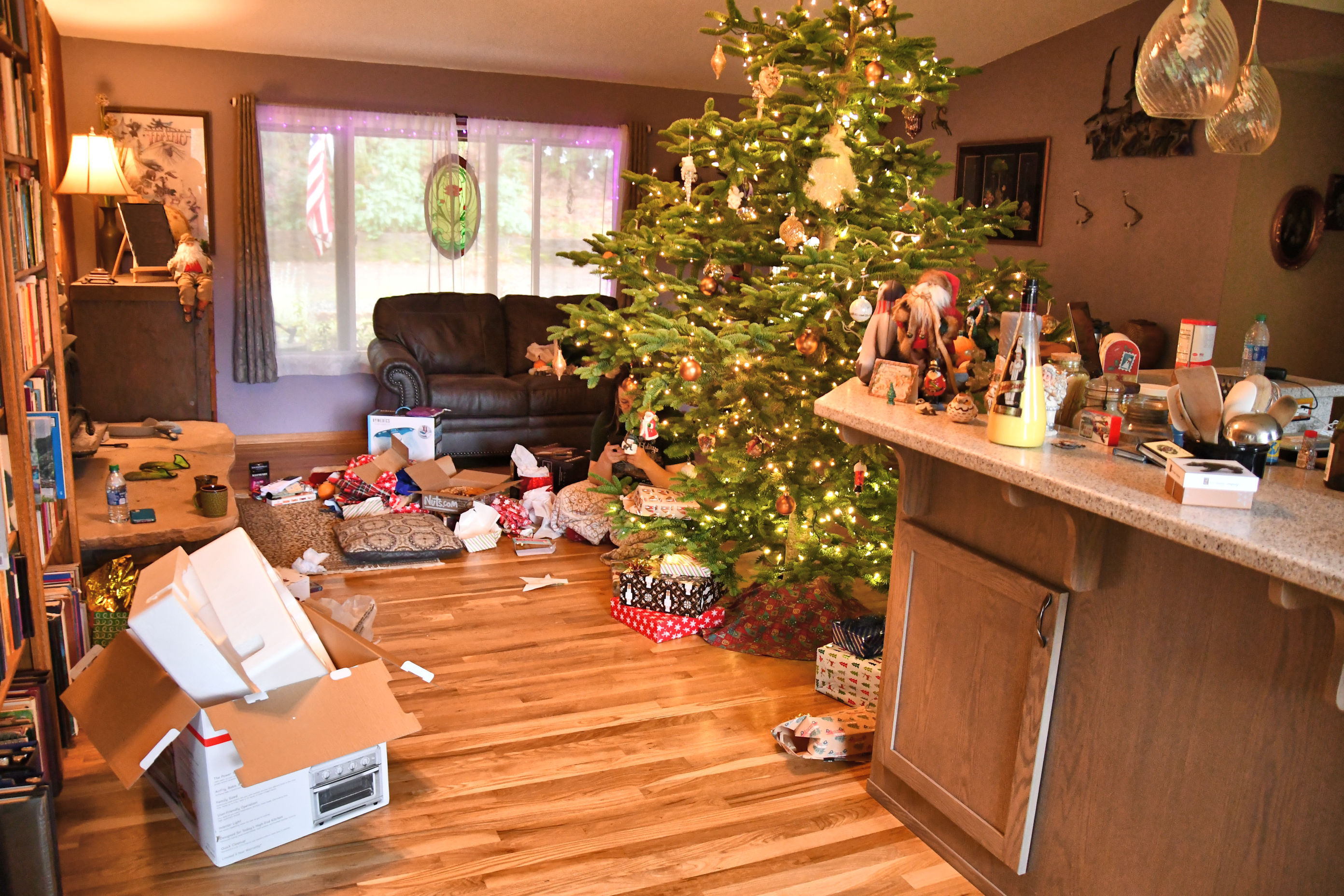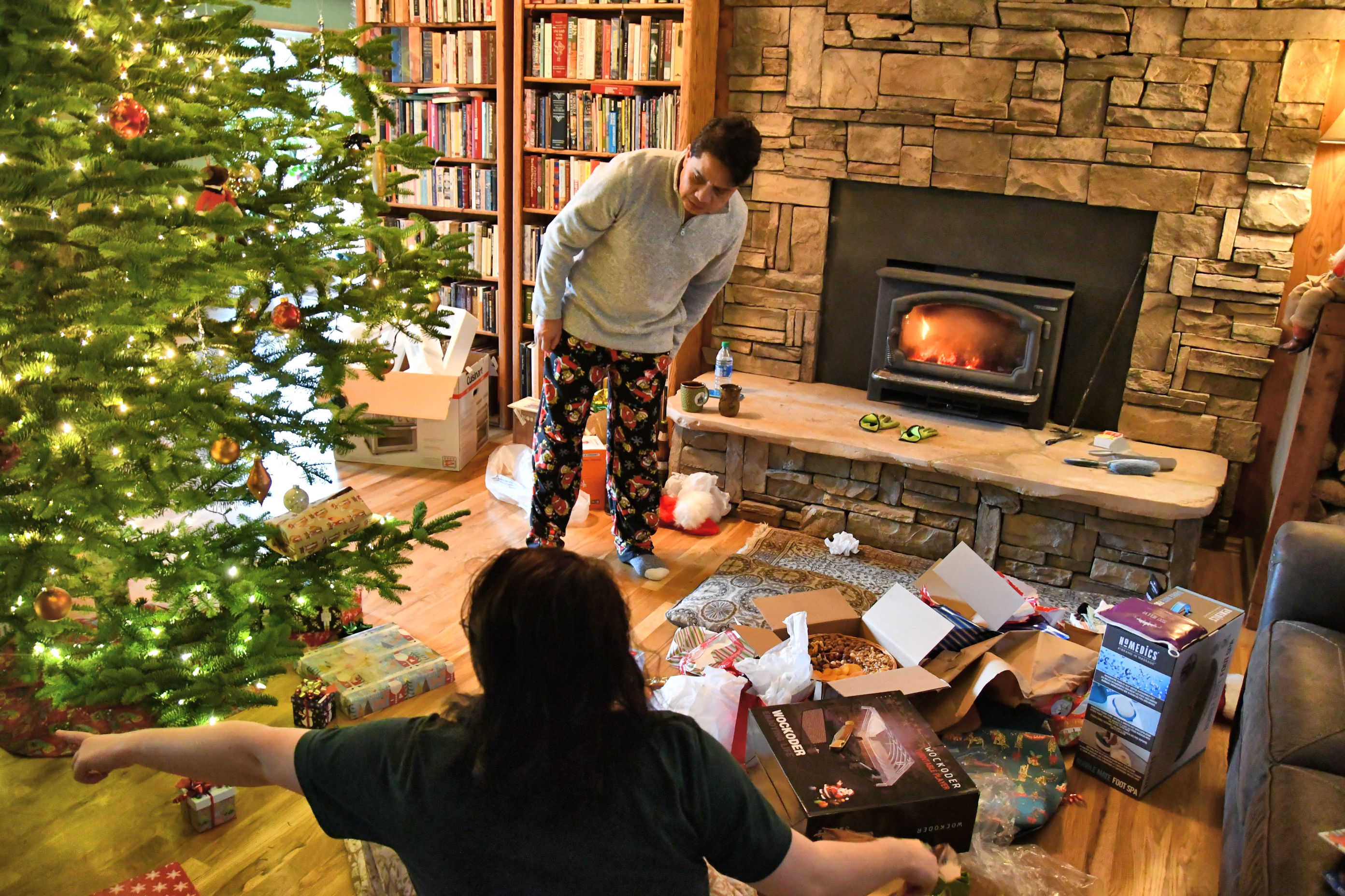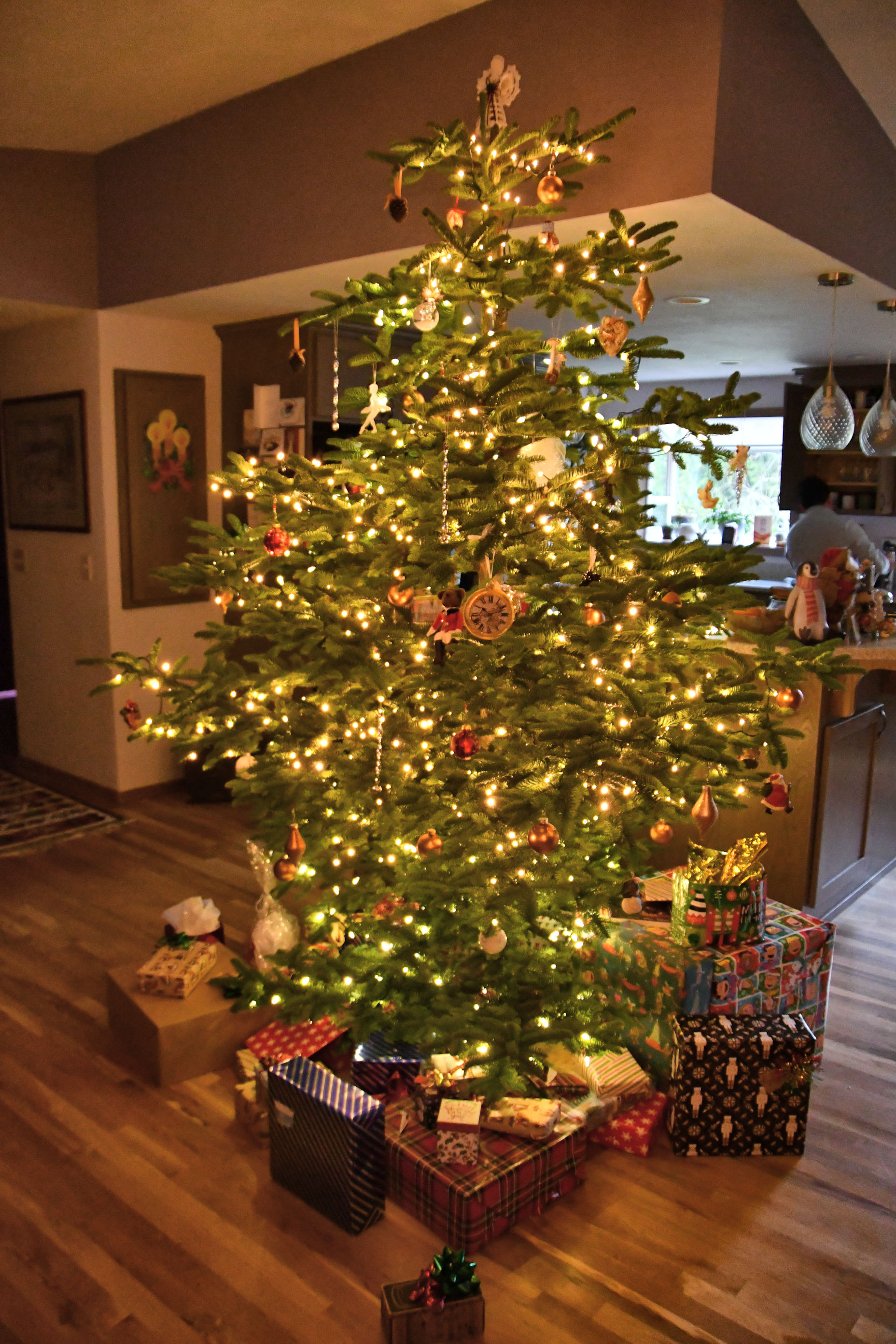 I call it a wonky tree because it has two tops. You can see in the naked tree pic, where two tree trunks rise to the top. The main trunk has a curve where a previous extra trunk was cut off years earlier. Also, it’s gorgeous and bushy in the middle, but the branches are short at the bottom. It’s a pear-shaped tree. There was one particularly big hole at the bottom, created because there were no branches at all. Fortunately, I knew Pedro had one gigantic wrapped gift for me at his house. I asked him to bring it over and I plugged the hole. You can see the giant gift (with Charlie Brown wrapping paper) on the right hand side of the tree in the photo above.