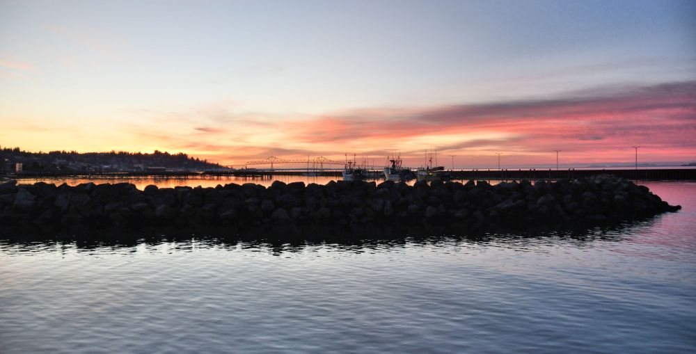 Looking west toward the mouth of the Columbia River as it empties into the Pacific Ocean. The bridge on the horizon is the Astoria-Megler bridge, 4.067 miles (6.55 km) long.