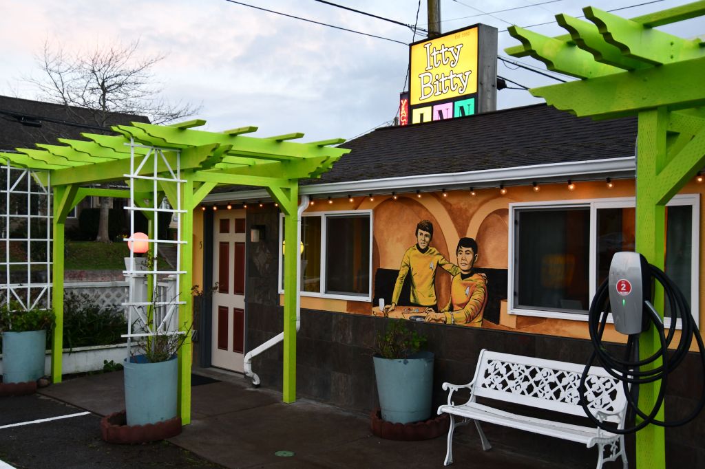 The place we stayed at the first night on our birthday road trip for Pedro was so much fun, it gets its own post. It’s the Itty Bitty Inn in North Bend, Oregon.