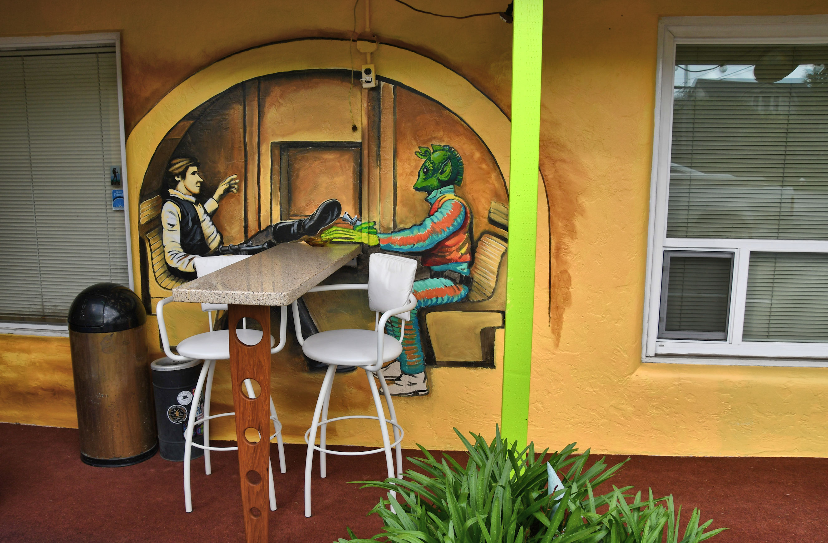 We continued exploring in the morning, and I discovered that there is a real AM radio on top of the Tiki Bar, and it actually works! I turned the dial till I found a station (it was a sports commentator, naturally), and played it while we packed our bags. Before we left, I made sure to get photos of every mural outside. The place is certainly welcoming of Star Trek and Star Wars fans, and the website includes photos of people who stayed here, wearing their Enterprise uniforms. So cute. They are also set up for Tesla fans, and the charging station is in the center of the parking area.