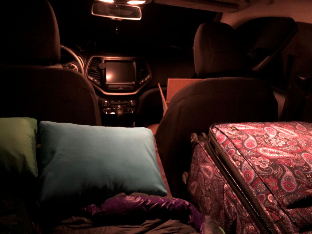Since I had to add an hour and a half to my driving time, due to the other camp being under snow, it was totally dark by the time I found the next camp site. It was very popular, and hard to find a place to camp in between the many other happy campers who got there before me, in the daylight. I couldn’t see well enough to walk out into the desert and find a spot to place my tent, so I got the idea to simply lay my seats down in the back of the Jeep and sleep there. It would be cleaner, that’s for sure!
