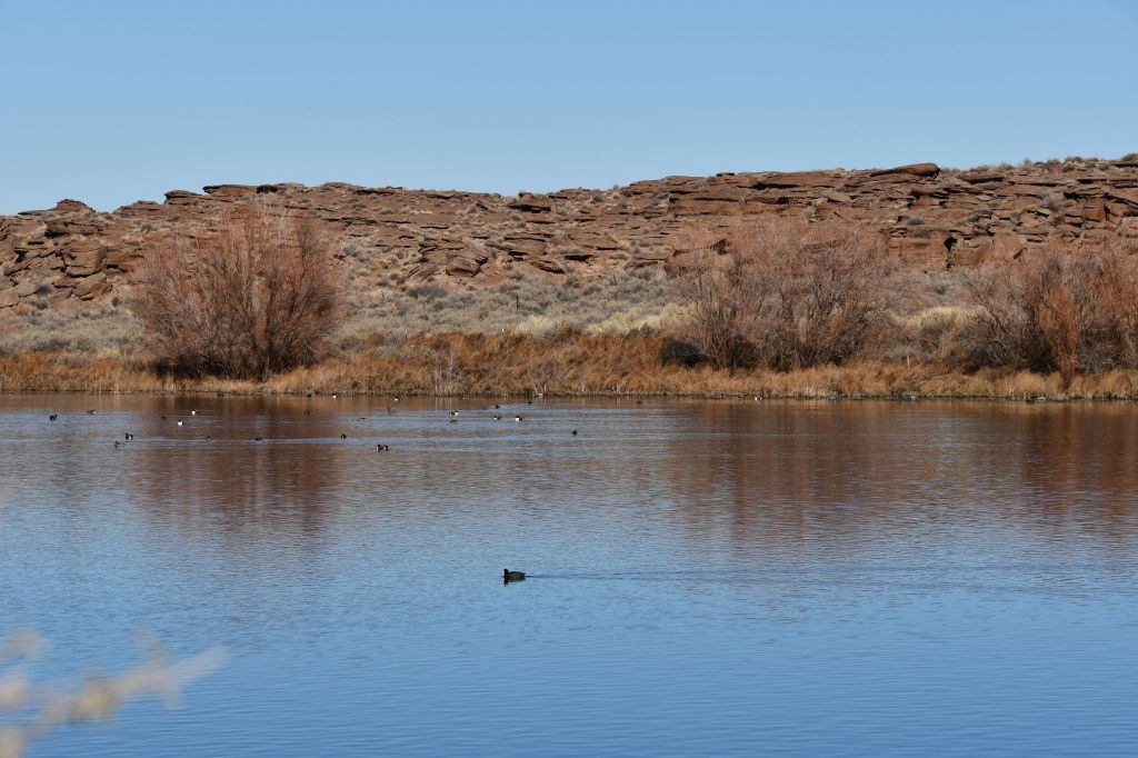 At the end of the road is space to park, and a trail to a lake, and park benches and information signs and I had NO IDEA this was out here. The info page in the hotel did not mention a lake. I saw birds everywhere and I can’t resist them, so I parked and hopped out. There are two information boards. One explains that this is reclaimed waste water and the city has chosen to route their treated grey water into this pond and let it filter through desert soils as the final step in cleaning. This way, birds from a wide area have a safe and watery place to live or visit. The next information sign listed the most common birds visitors will see. It did not identify the two main birds I saw, however, so I had to look them up.