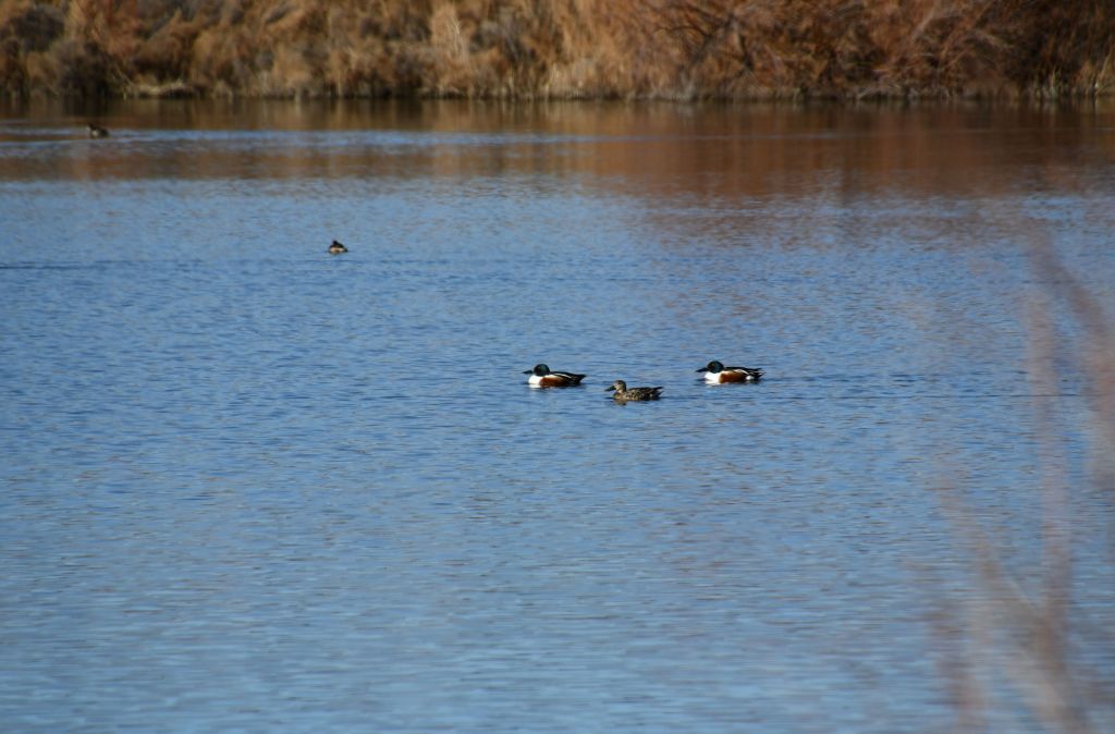 I tried my ninja stealth skills, but they were worthless, and before I got anywhere near them, the shovelers flew as if possessed by demons, to the opposite side of the lake. The coots, which require much effort of flapping and pushing off water with their feet in order to gain flight, chose to paddle ferociously away from me. The paddlers were slower and thus I got my first shots of the coots. I sat down on a tire and waited till the shovelers came a little closer and got some shots of them too.