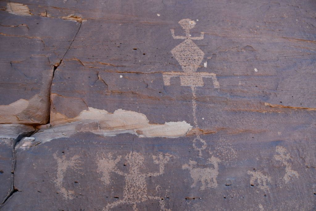 I’ll confess I don’t hold these in the same kind of reverence as I am taught to. I am in awe, as you have noticed. But I do not assume they were all created by some wise holy person as a plea to a god, nor that they are messages about crops or strong babies. Every time I see a cluster of pictographs or petroglyphs, I visualize a couple of teenagers who snuck away from their uncle and each one holds a hammer rock in one hand, and they are snickering and hammering out pictures of each other, and deer they intend to kill one day, and drawing goofy images of their uncle, and then laughing until their ribs ache.