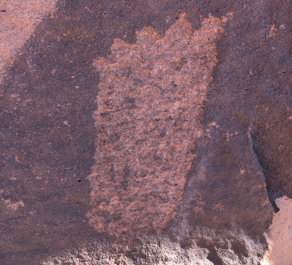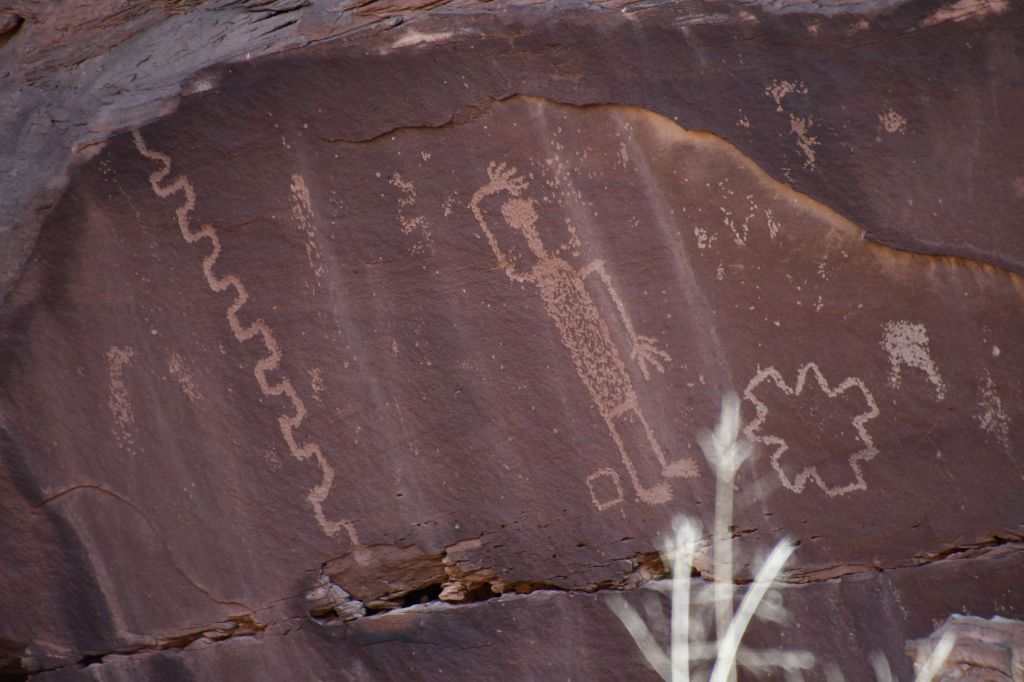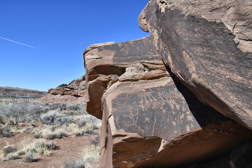 I spent a happy hour there, but then started thinking about petroglyphs again. I drove back to the turn in the road and parked once more, and headed for some picnic tables with awnings for shade. As I drew closer, I saw more information boards, explaining about the petroglyphs on the rocks here. They are mostly from the Pueblo II and Pueblo III peoples, it said, with some from the Basketmaker and Archaic as well. Now, it’s been a while since I got my anthropology degrees, and furthermore I focused on cultural anthropology and not so much archaeology, but I recall that groups of ancient peoples with characteristics in common are named by modern scientists. Over time, that named group can be dated. This helps to make sense of things. If the pottery and tools have all the characteristics of X group of ancient people, they use that as a beginning investigation point. The information signs were telling me that styles of petroglyphs are likewise assigned to a group and dated.