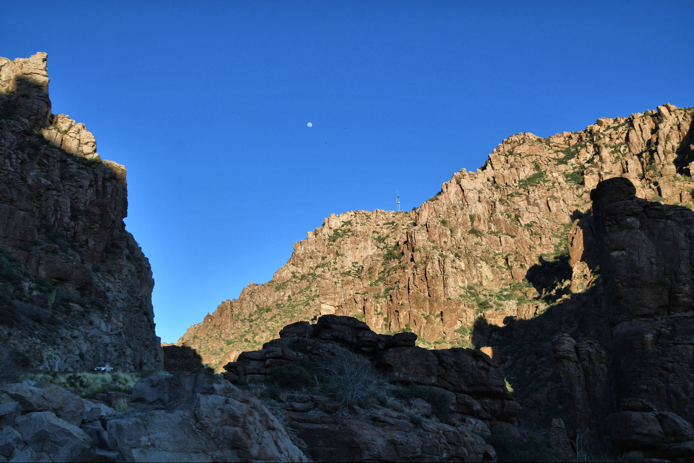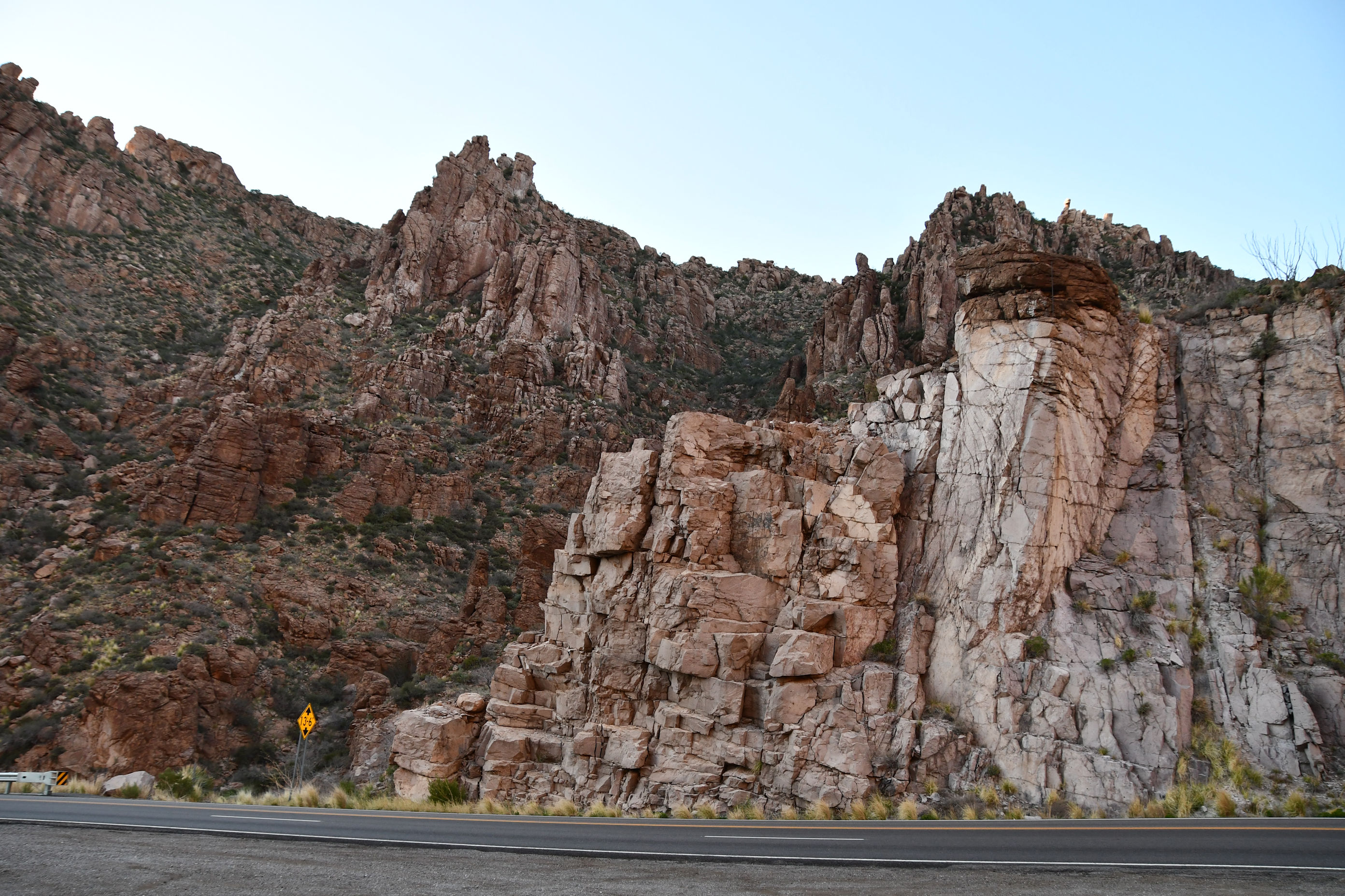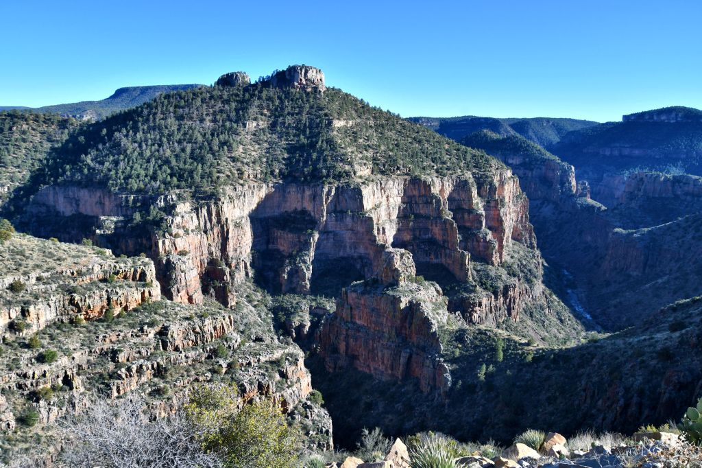 I curved around and around, no wonder Marlene recalled this road. But I was perpetually in awe and constantly looking for a wide place to pull over. I missed multiple spectacular shots because I could not safely stop. I certainly couldn’t take photographs while driving in this section; my attention needed to be on driving. Eventually I reached the bottom of the canyon, crossed a bridge over the Salt River, and began winding up the other side.