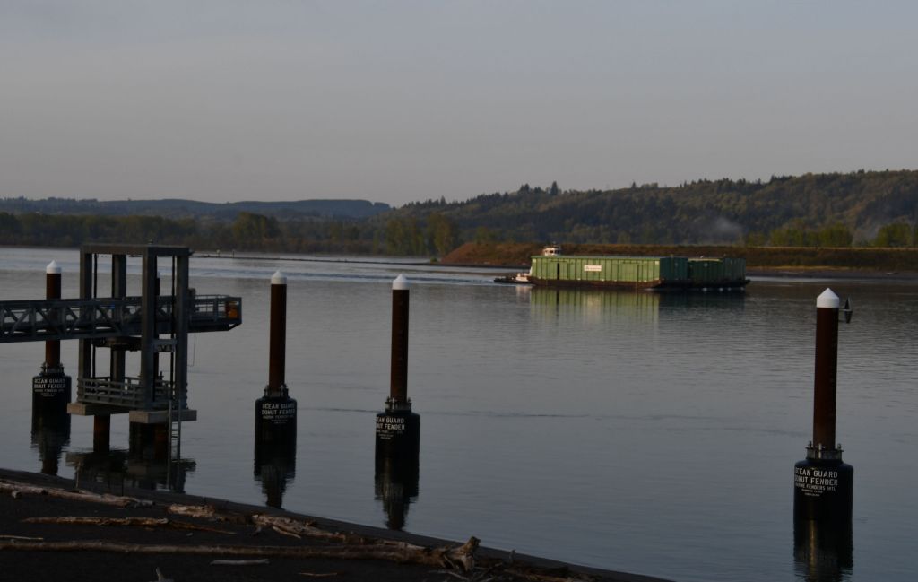 A tug pushes a barge along the mighty Columbia River, which seems quiet and peaceful this day.