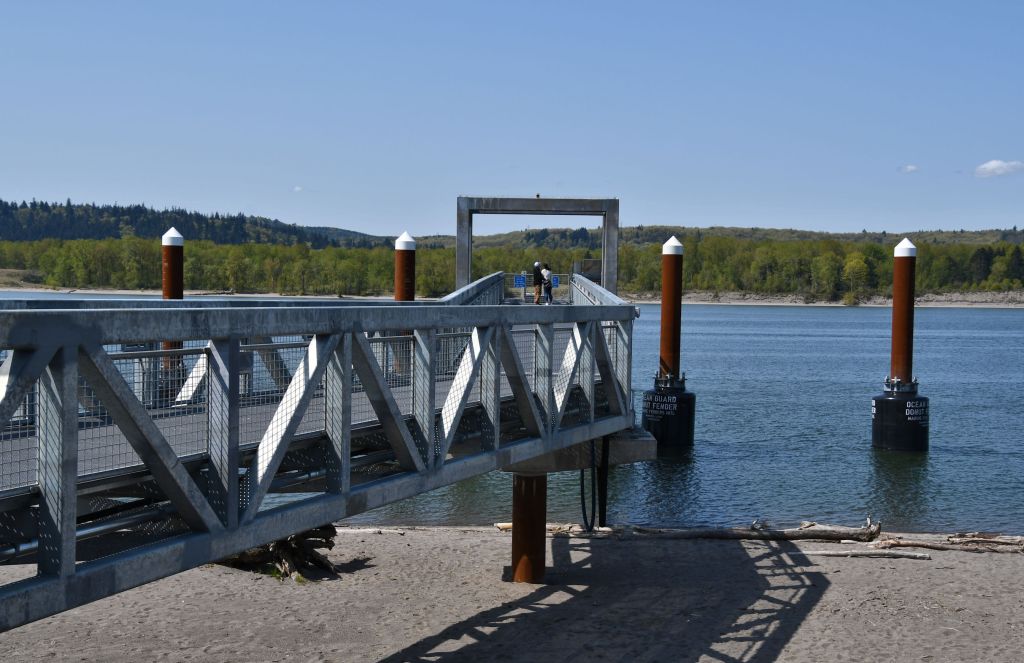 As the sun climbed, the sky became more blue. We checked out of our room and walked the path along the river. There has been a lot of construction here. Adjacent to the building, on the side with the totem poles, is now an outdoor amphitheater with a grassy lawn designed to hold an audience. Across from the lawn (still cordoned off while the grass gets established) is a brand new dock and permanent approach ramp.
