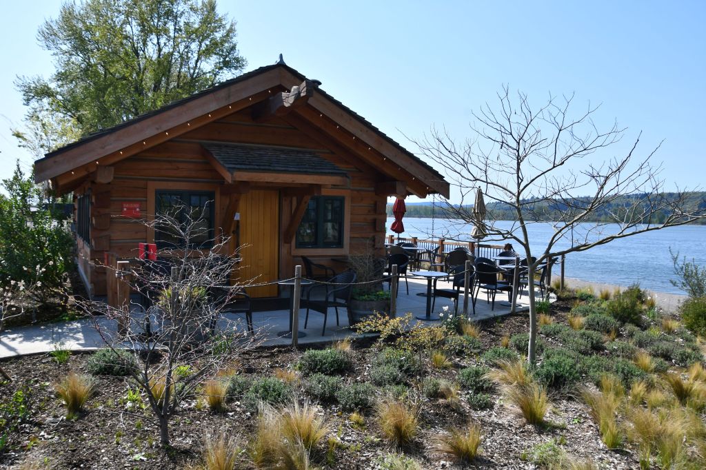 We walked half a mile, enjoying the path between parks and river. We came to the final bit of McMenamin’s property, called the Ahles Point Cabin. It’s a tiny bar – McMenamin’s properties often include tiny bars – that might have a capacity of hosting 20 people inside comfortably. It remains closed since the beginning of the pandemic, and Pedro and I hopped the chain fence to explore it.
