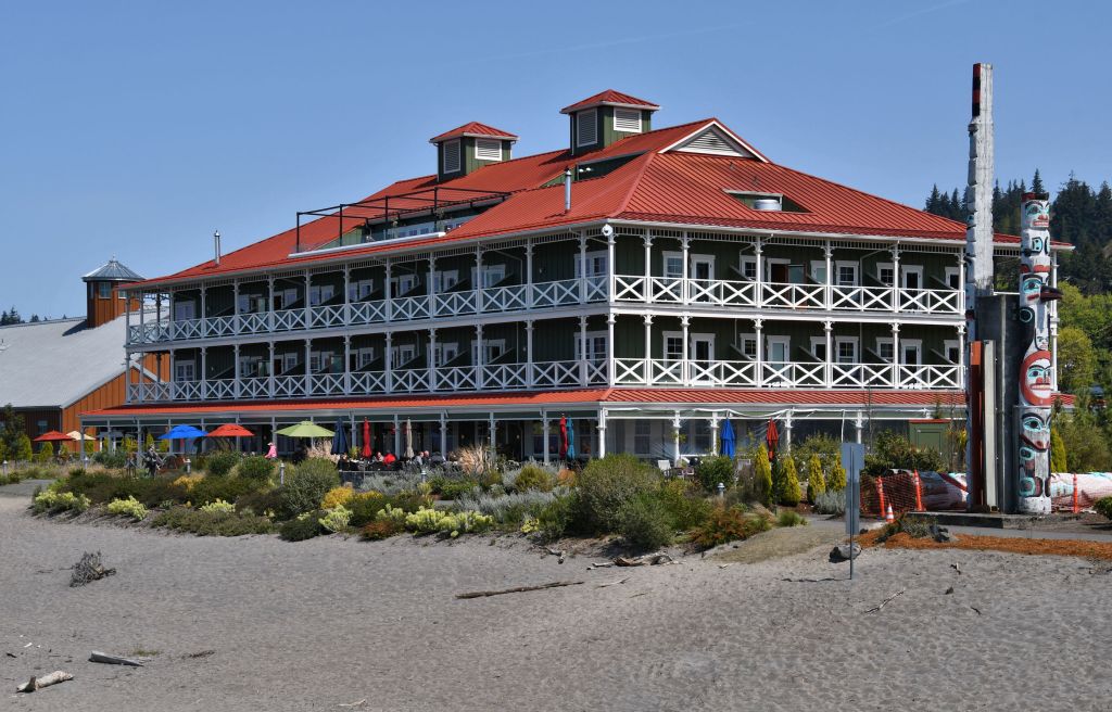 Kalama Harbor Lodge Hotel in Kalama, Washington. You can see a bit of the fourth floor Cloud Bar on the roof. The totem poles were carved by a man named Don Smith, who considered himself Native and used the name Lelooska. He was an exceptional carver, but not a member of the Kwakwaka’wakw tribe.