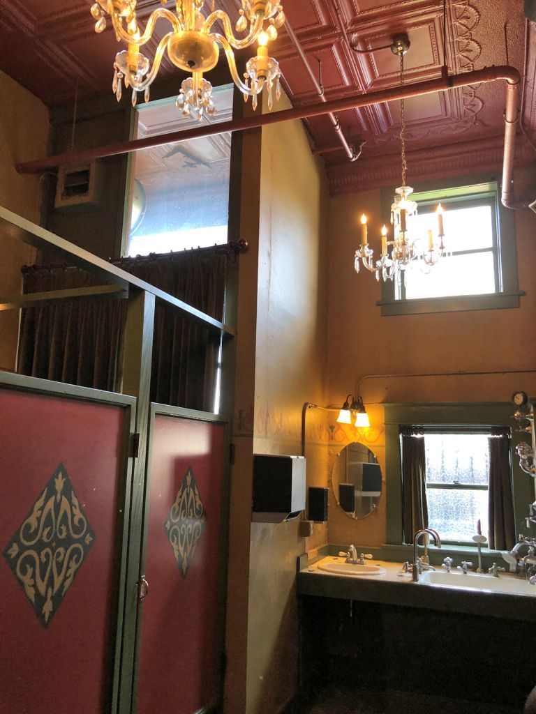 Next we headed down the hall to the theatre, which was roaring with music and we were astonished that we had not heard it from the front of the place. I had renewed curiosity at the former bathroom attendant, who was now zipping between the kitchen and the restaurant, in the very same hallway, who certainly knew about the hullabaloo in the theatre. Clearly communication between us had failed somehow, but regardless, we had completed our quest.