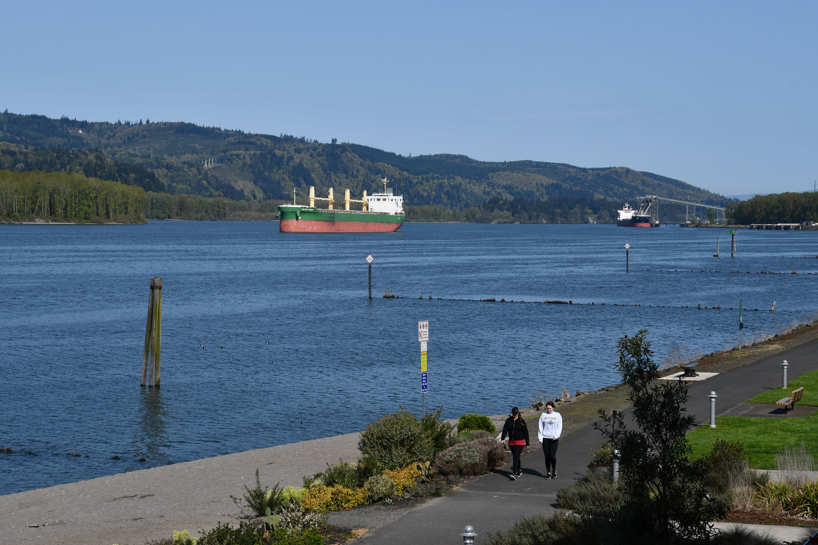 As the sun climbed, the sky became more blue. We checked out of our room and walked the path along the river. There has been a lot of construction here. Adjacent to the building, on the side with the totem poles, is now an outdoor amphitheater with a grassy lawn designed to hold an audience. Across from the lawn (still cordoned off while the grass gets established) is a brand new dock and permanent approach ramp.