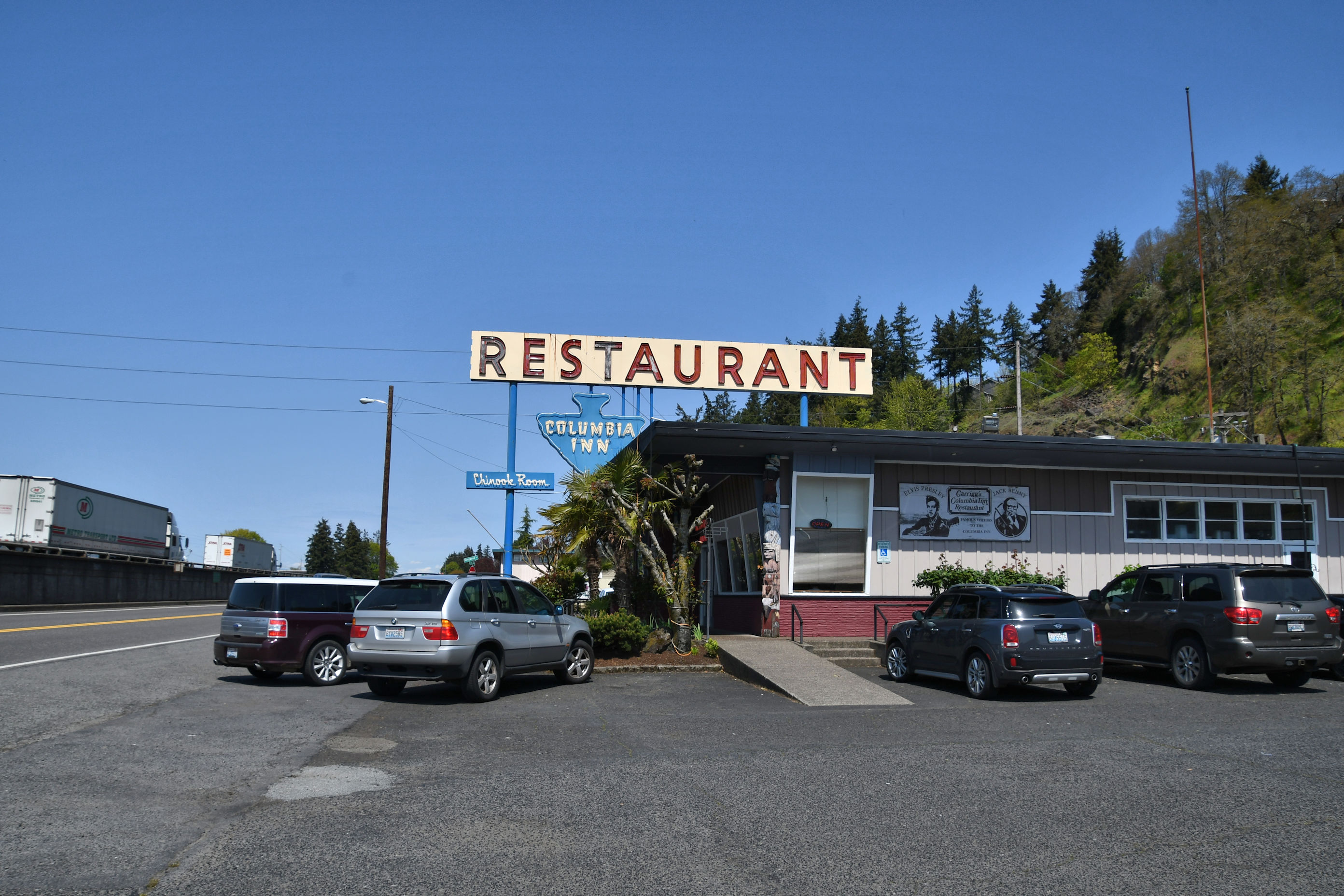 The Columbia Inn is very close to Interstate 5 (you can see the trucks), but surprisingly hard to access from there. The giant red neon letters constantly go out. Here, you see the R and the T are out. My favourite was three years ago when the A and the U went out, and the sign proclaimed, “REST RANT.”