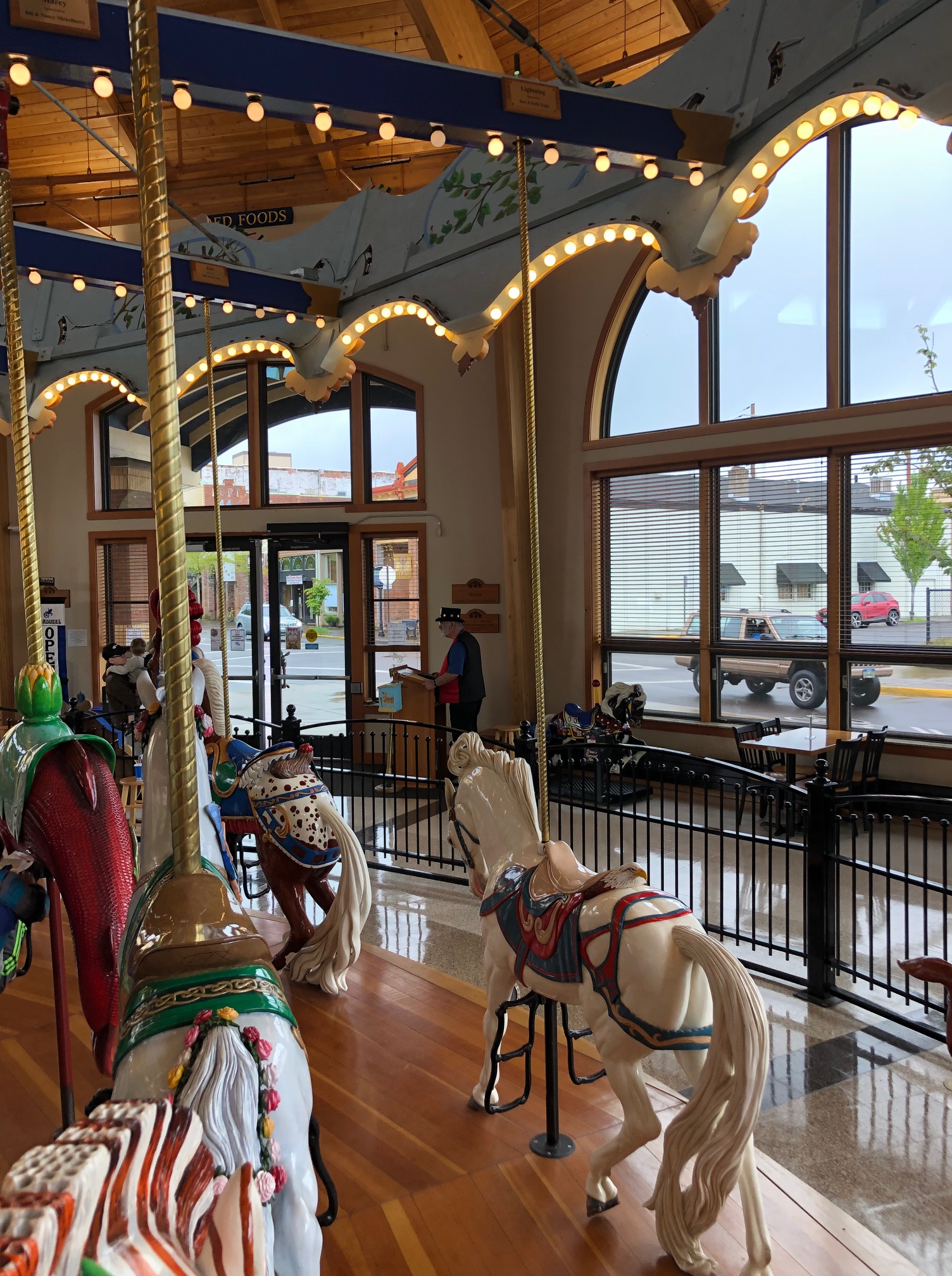 First, I drove down to Albany, Oregon and picked Tara up from work at the Historic Carousel Museum. They had handed out carnations to moms early in the day, and Tara had nabbed one for me, knowing they would all be gone by the time I got there. T handed me my flower and told me to get in line. It was Sunday, Mother’s Day, and all mothers were invited to ride for free. I definitely accepted the invitation!