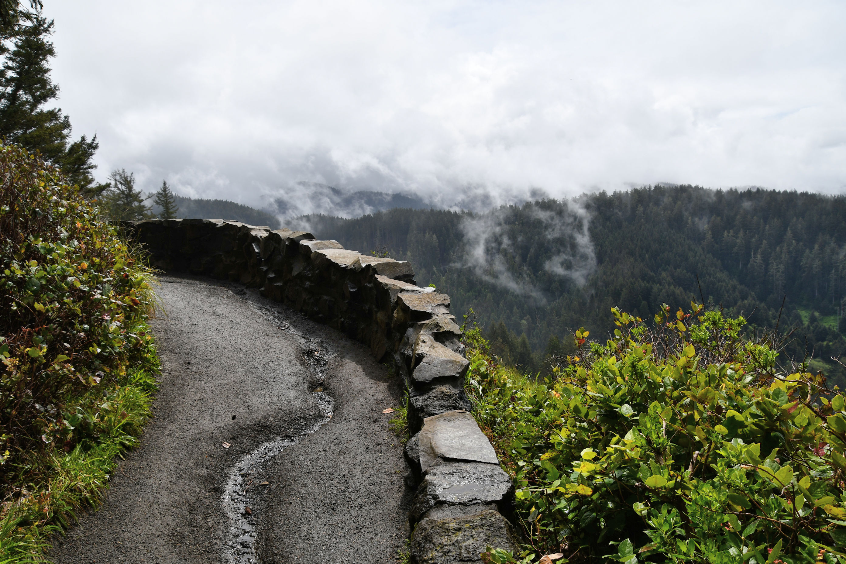 They weren’t exactly sure where it was, but we had all day and as long as we were driving around the Oregon Coast in the Jeep, we were warm and dry. Eventually, I turned onto a road at Cape Perpetua and Tara recognized it. “Yes! This is it!” We wound up, up, up to the top and found a parking area, and restrooms which are a necessity when you’ve been traveling with mugs of coffee. Then we put our things into a bag and went in search of the trailhead.