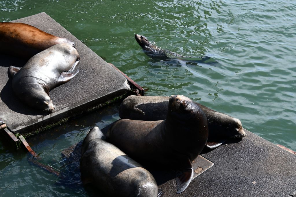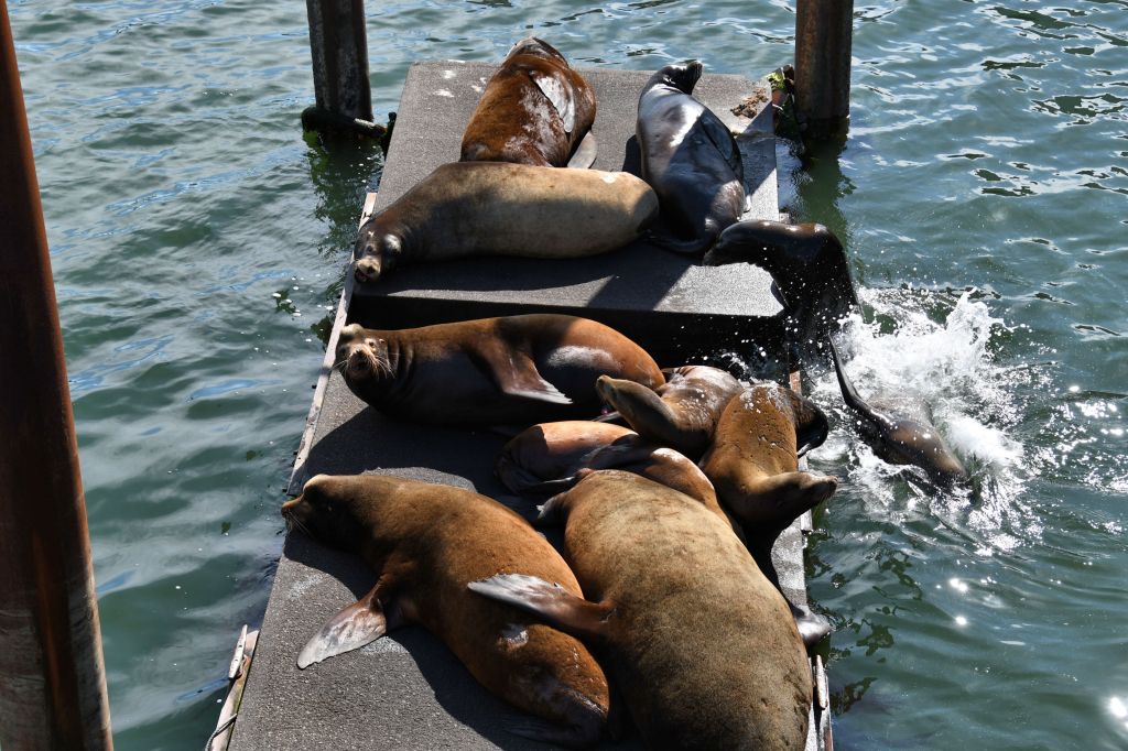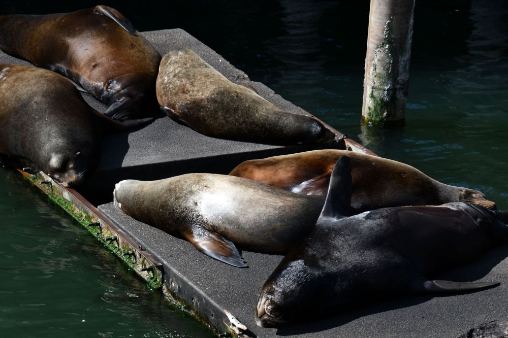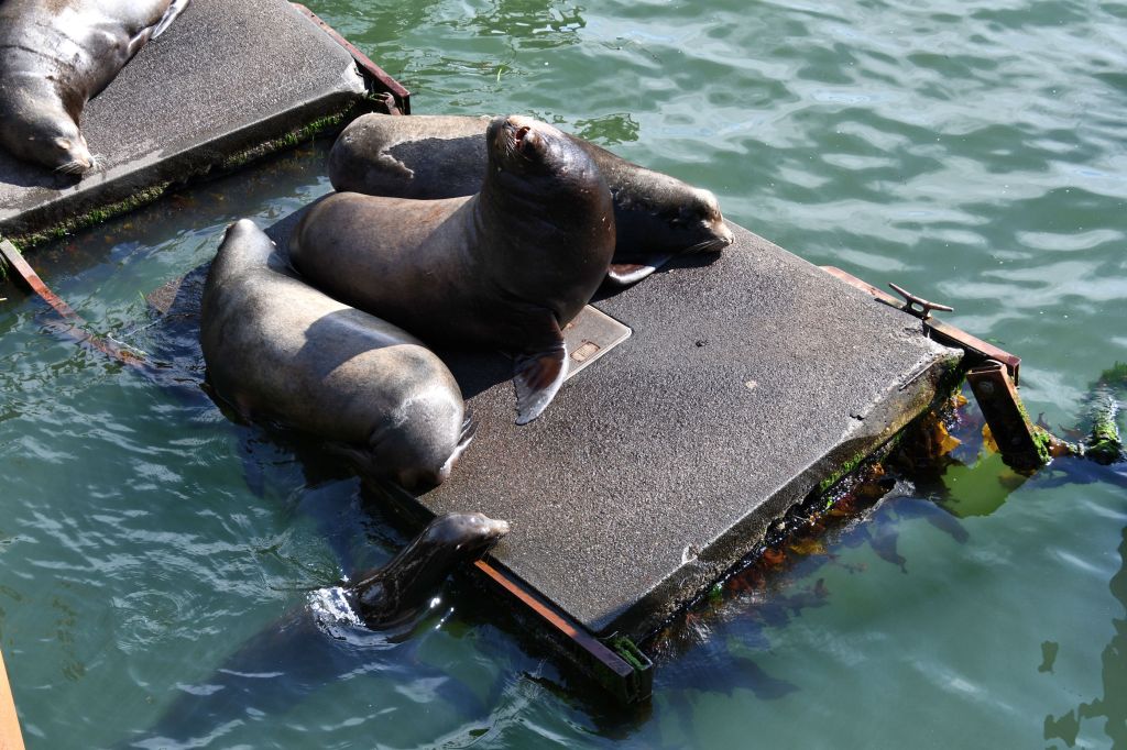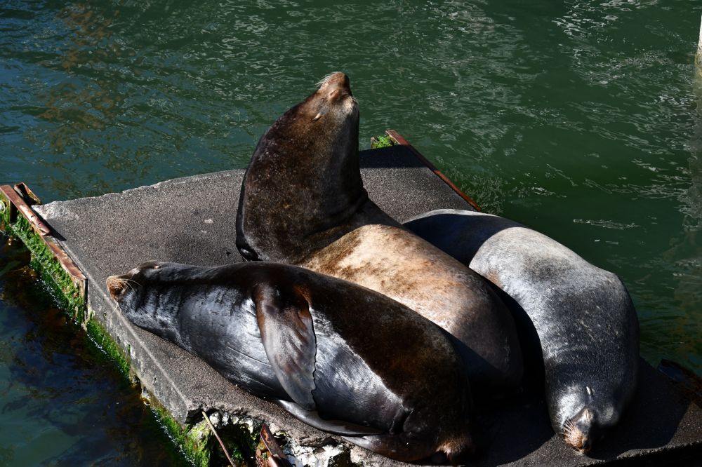 At last the tourists had thinned out a little and gave us front row seats to watch the sea lions. Their incessant loud barking is impossible to ignore forever. We watched the gigantic elders, who had been sunning themselves for so long they were dry. The biggest, fattest ones gave themselves lots of space on their floating docks and would not share with anyone, though there was room. We watched younger ones piling together on separate docks, and the youngest of all – a small black sea lion and apparently without allies, who tried unsuccessfully to find a safe place to nap.