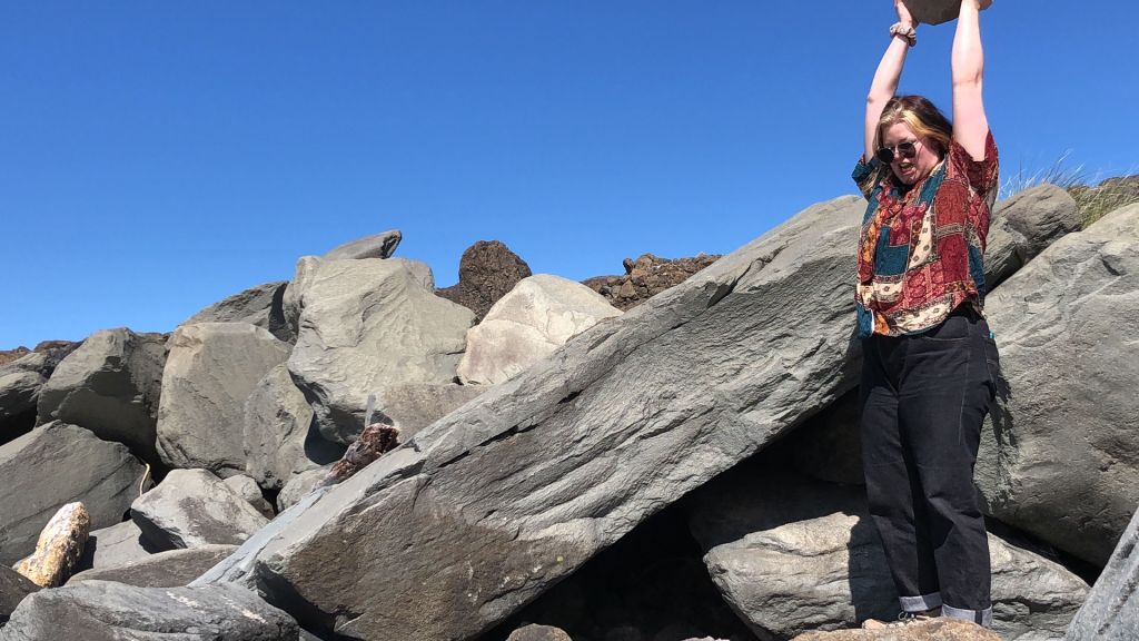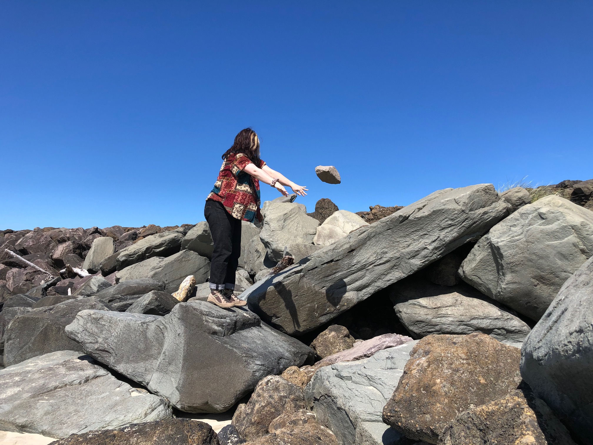 When rocks are weather-beaten, as these are, it’s hard to identify them and apparently geologists can break rocks open to get more information from the inside of the rock. I watched with amusement as Tara began throwing a rock around.