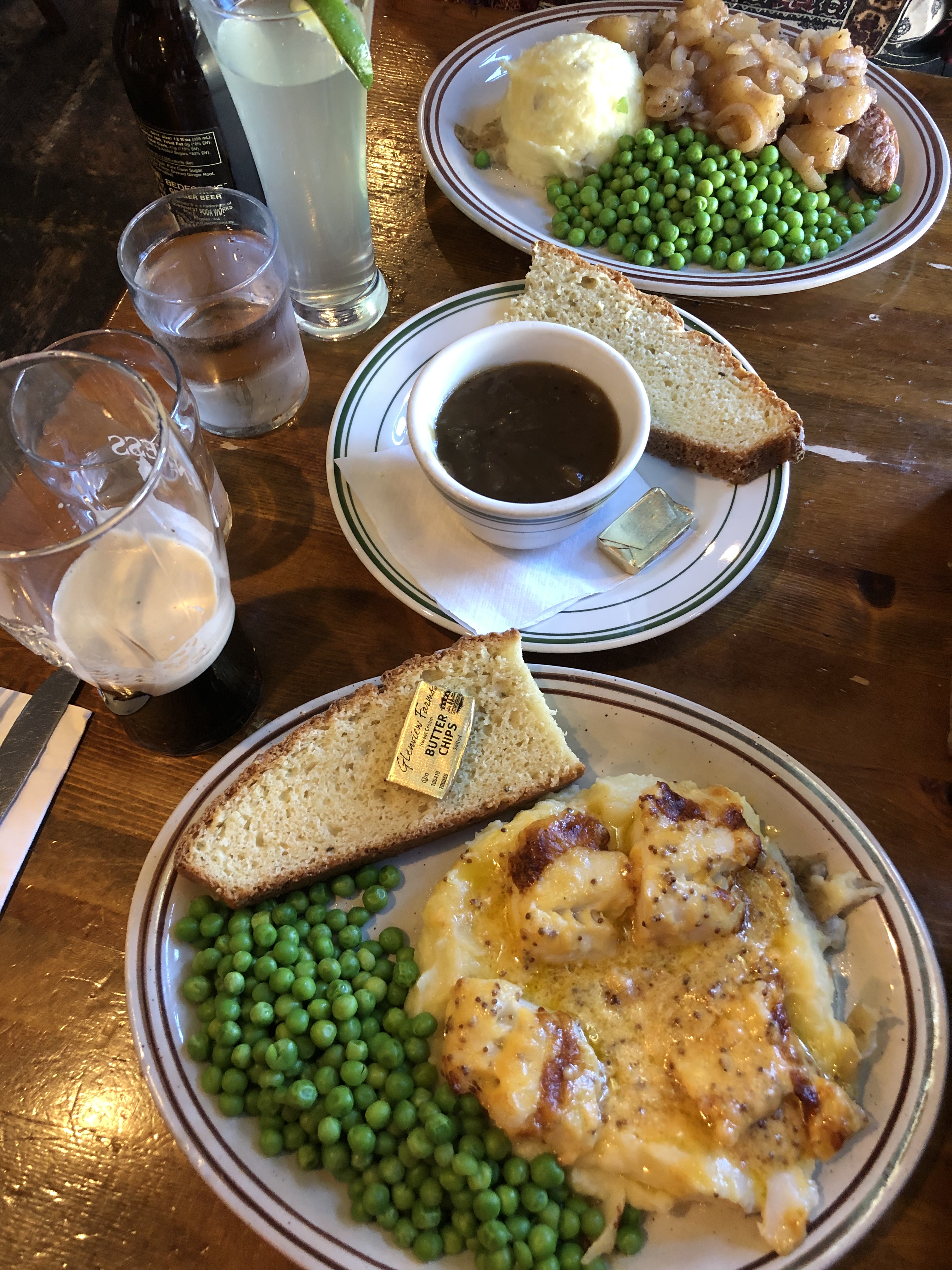 At Nana’s we were seated quickly because we showed up after the typical lunchtime, so there were tables open at this very popular restaurant. Tara ordered the Taigue’s Delight, which is Irish style sausages smothered in seasoned apples and onions sauteed in Magners hard cider, served with mashed potatoes, and a side of mushroom gravy. I ordered Galway Cod Au Gratin, which is wild caught NW cod, topped with Tillamook sharp cheddar, stone-ground mustard and cream, baked to a bubbly goodness. Served atop mashed potatoes. Both with peas and Irish soda bread. We practically licked the plates clean. We took an order of Scotch eggs to go for Cameron.