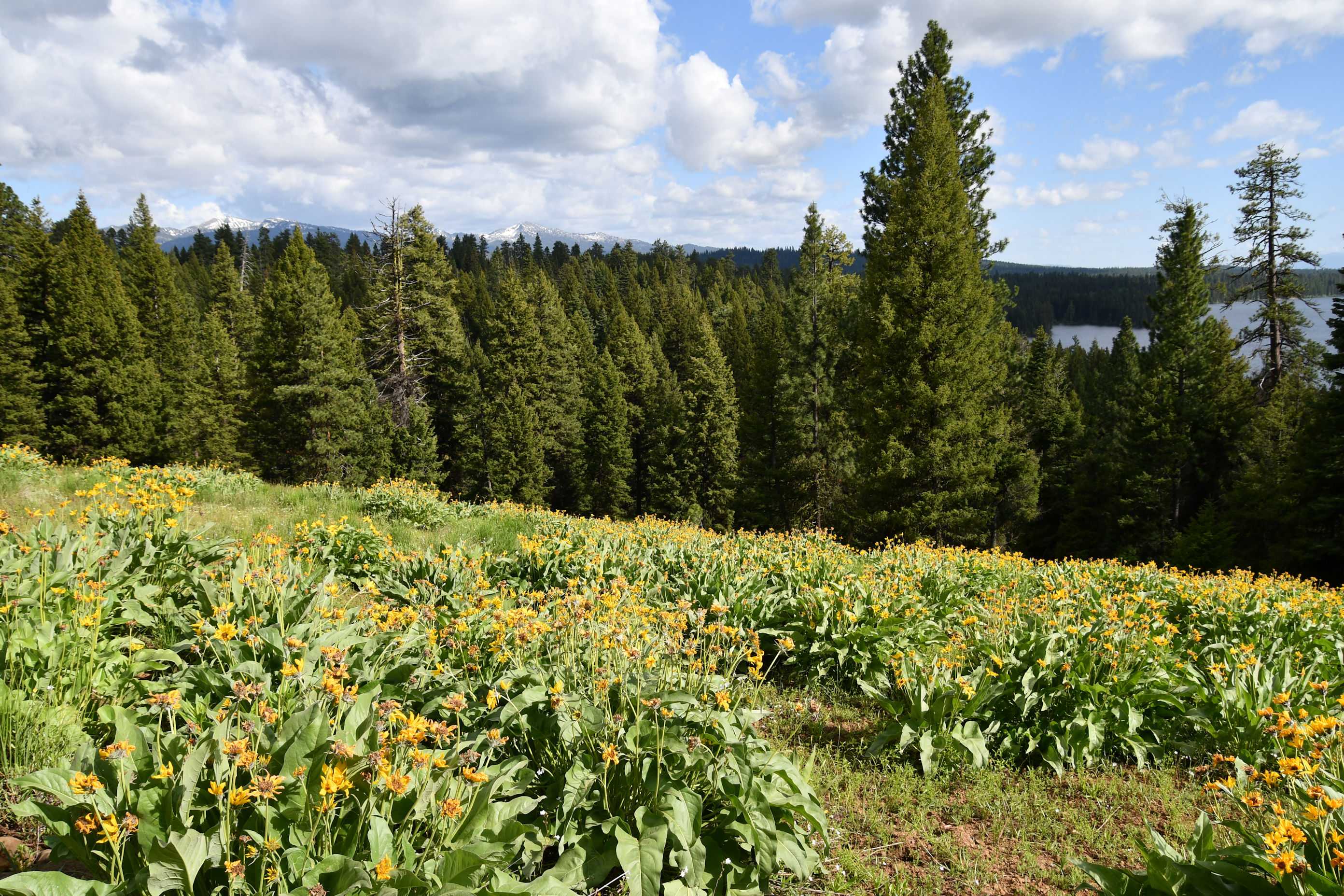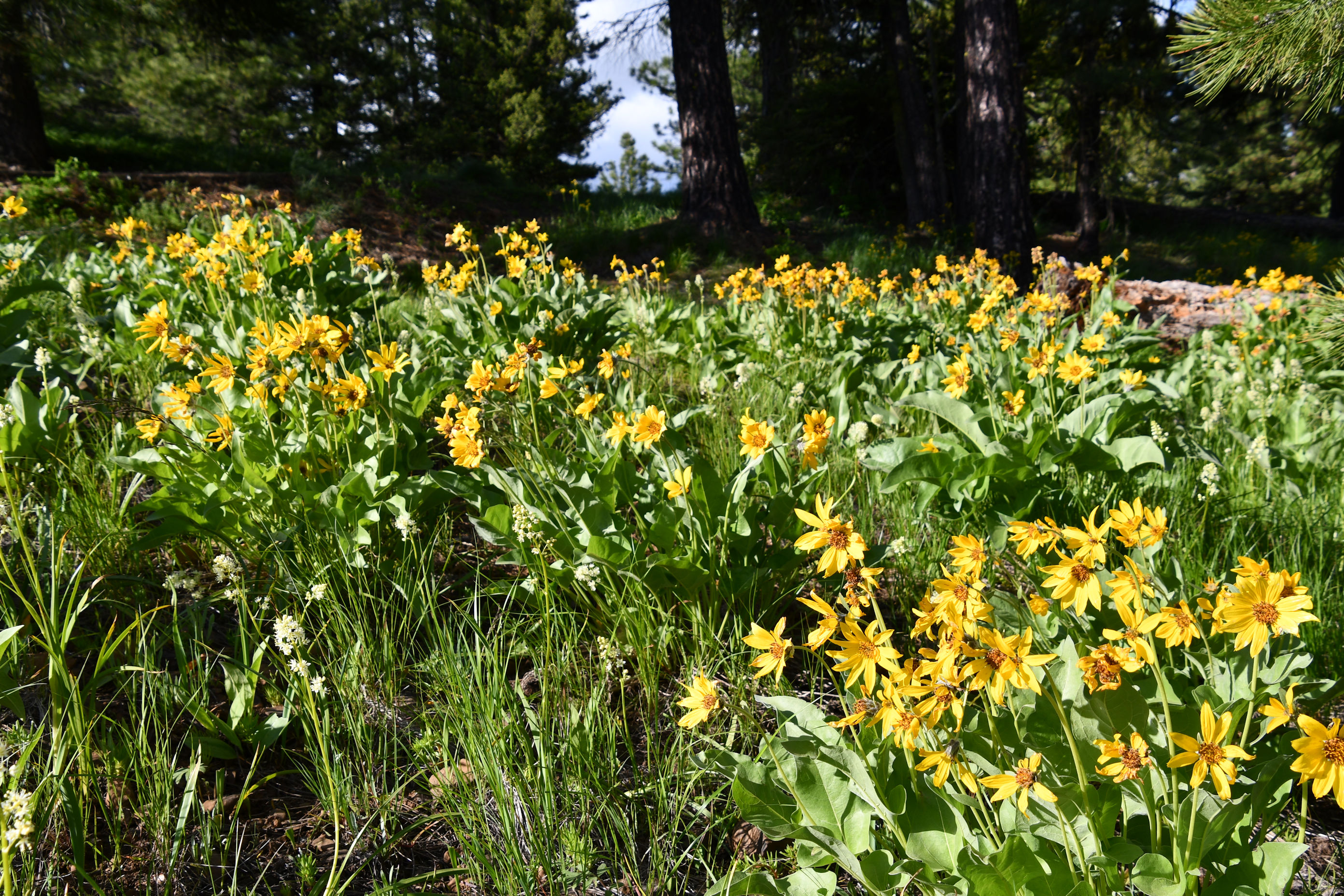 I loved it up there. At the Narrows Overlook in Ponderosa State Park, I decided to have a picnic. I grabbed the potluck salad, and the wine, and went to find a place to relax with my supper. There were park benches but it was too windy right on top. I went over the edge of the hill into a meadow filled with Arrowleaf Balsamroot covered in gorgeous deep yellow blooms.