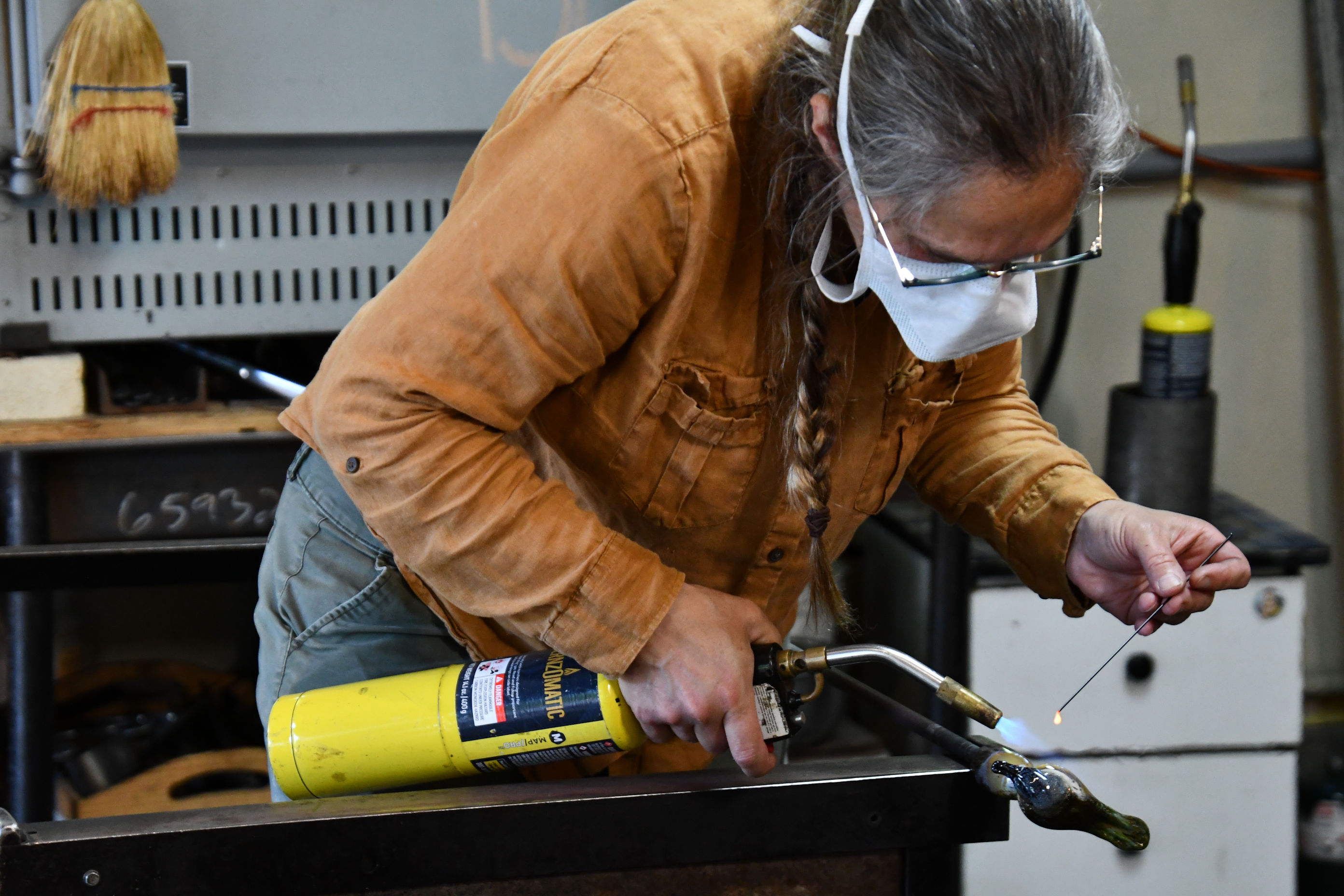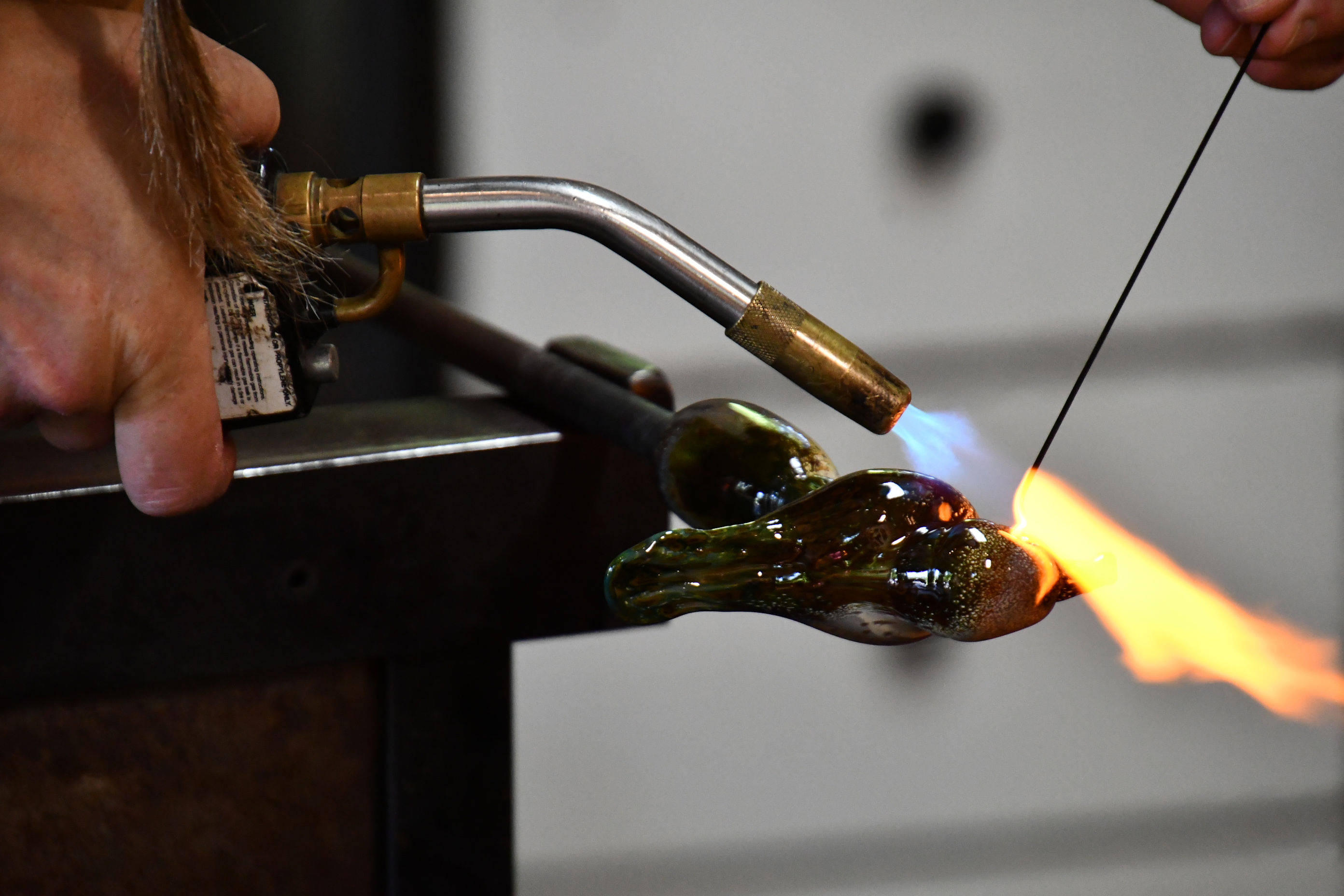 We stepped out of the main building and tried to get our bearings. We walked into a garden into the shade and looked at our map till we made a plan. Then we exited the garden. Directly in front of us was a sign that said “Glass Blowing.” I had not expected this at all. We wanted to investigate. Inside the Gorge Glashaus, a building that used to be the administrator’s garage, we found an artisan’s workshop.