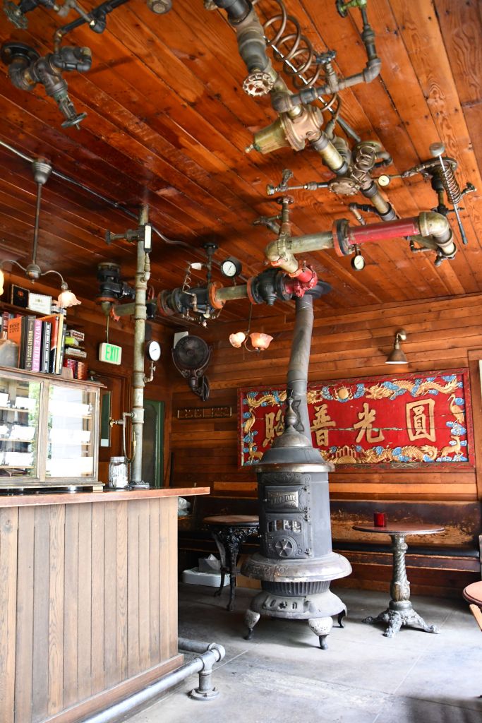 We enjoyed this wood stove, and the fabulous pipes on the ceiling. The glass case to the left holds cigars.