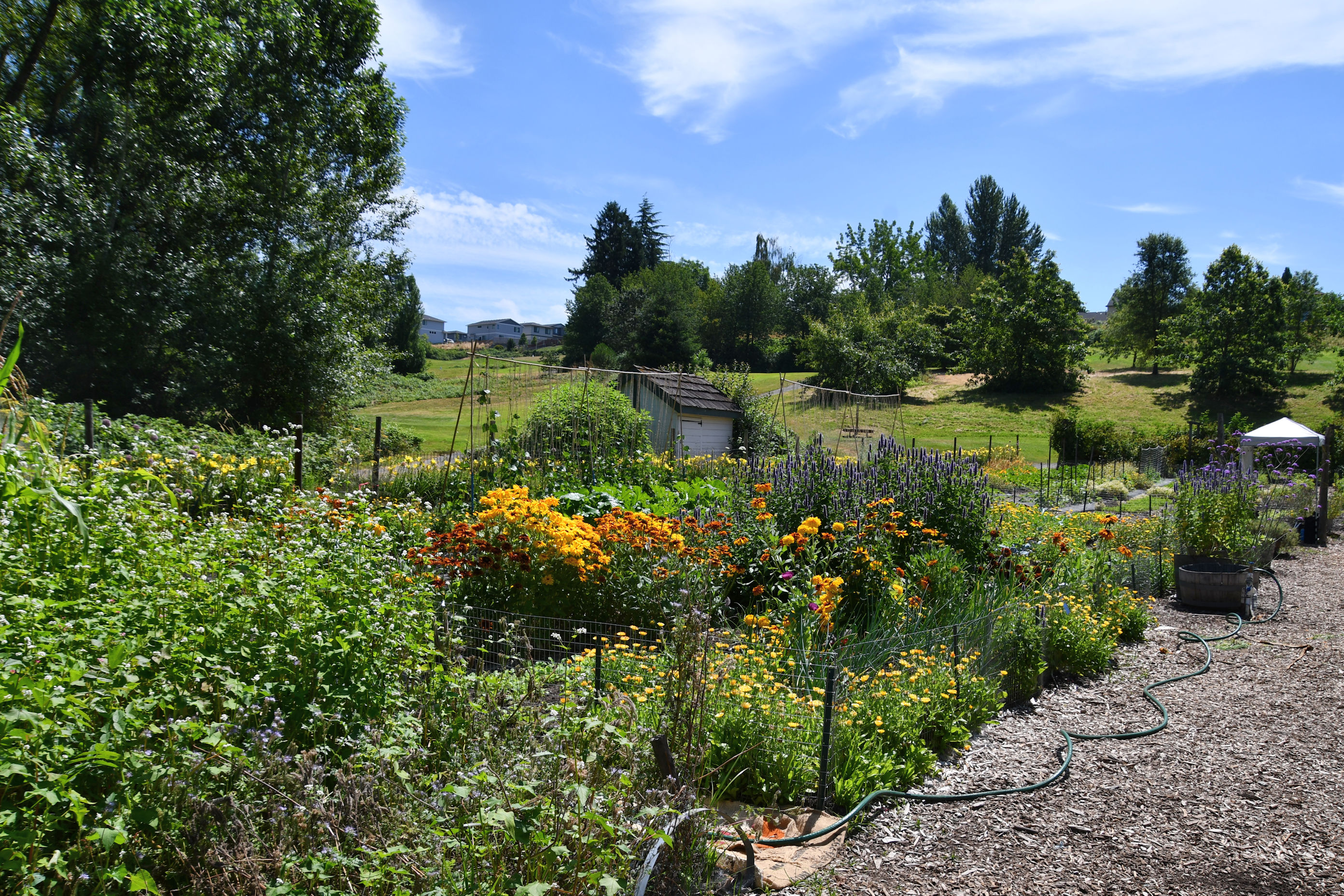 The vegetable garden from another angle. You can see the golf course behind it, and a Troutdale neighborhood behind that.