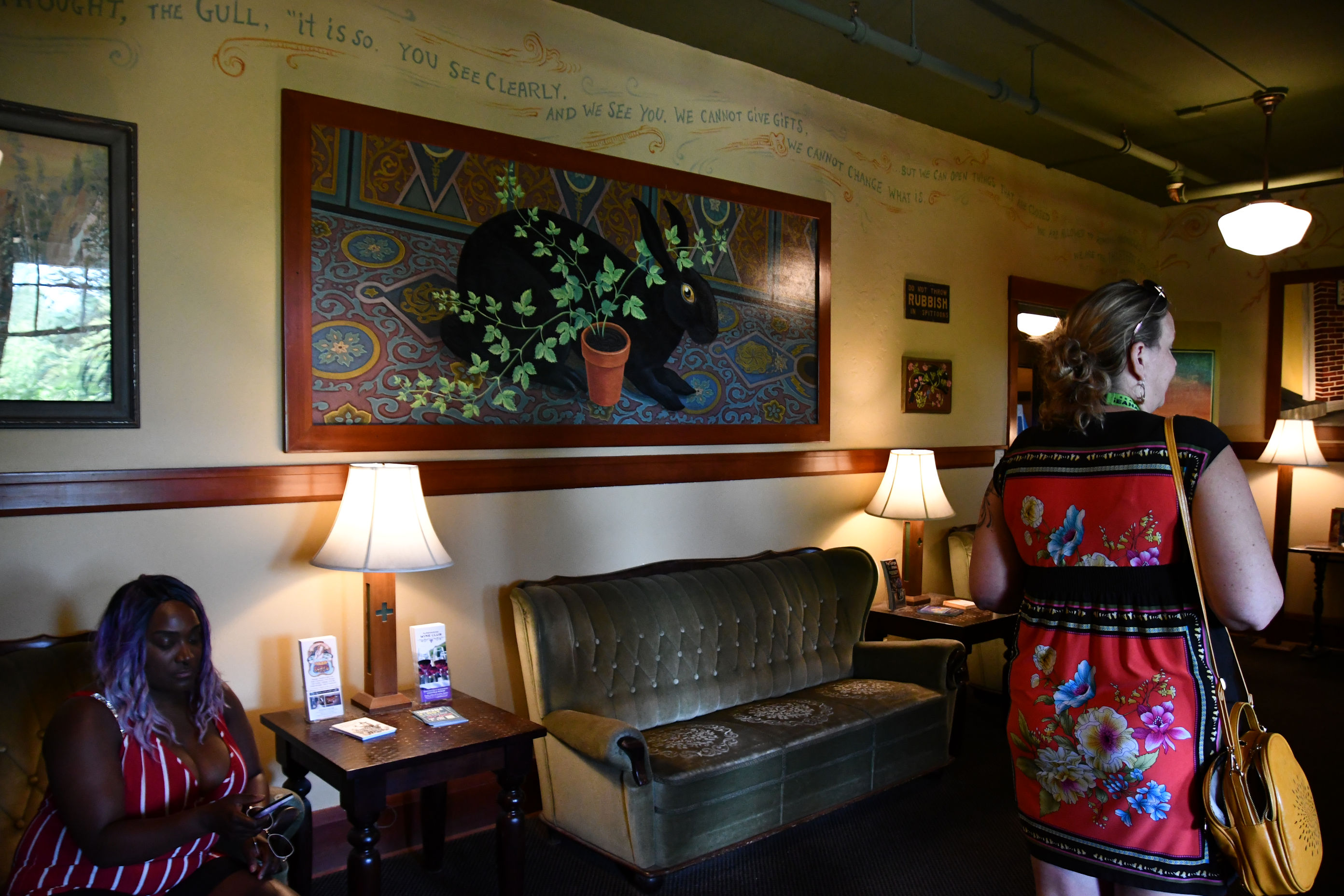 Near the Halfway House is the Black Rabbit House, another tiny building. You may have noticed the black rabbit in a painting in the hotel lobby. The rabbit is famous on these grounds, and was considered a good omen by the McMenamins brothers. Apparently an escaped pet rabbit was living large here in the years when construction was ongoing in the 1990s, and workers spotted it all the time. There is even a photograph of the rabbit hanging in a hallway. It became a mascot. Eventually one day, the rabbit was found dead beside this little hut, and the hut got its name. The mascot was buried in a place of honor on the grounds.