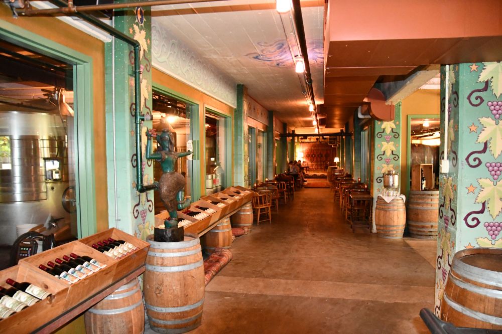Our guide pointed out the murals at the top of the walls that lined the largest room. He said it’s a painted rendition of the history of beer brewing in the world. The first scenes are the evolution of plant life, it moves to Egyptians and to what became England. It shows relevant beer scenes through time and ends with a depiction of McMenamins Edgefield. Quite amusing. Not sure what Stonehenge has to do with brewing though? Maybe the artist, Joe Cotter, was taking liberties.