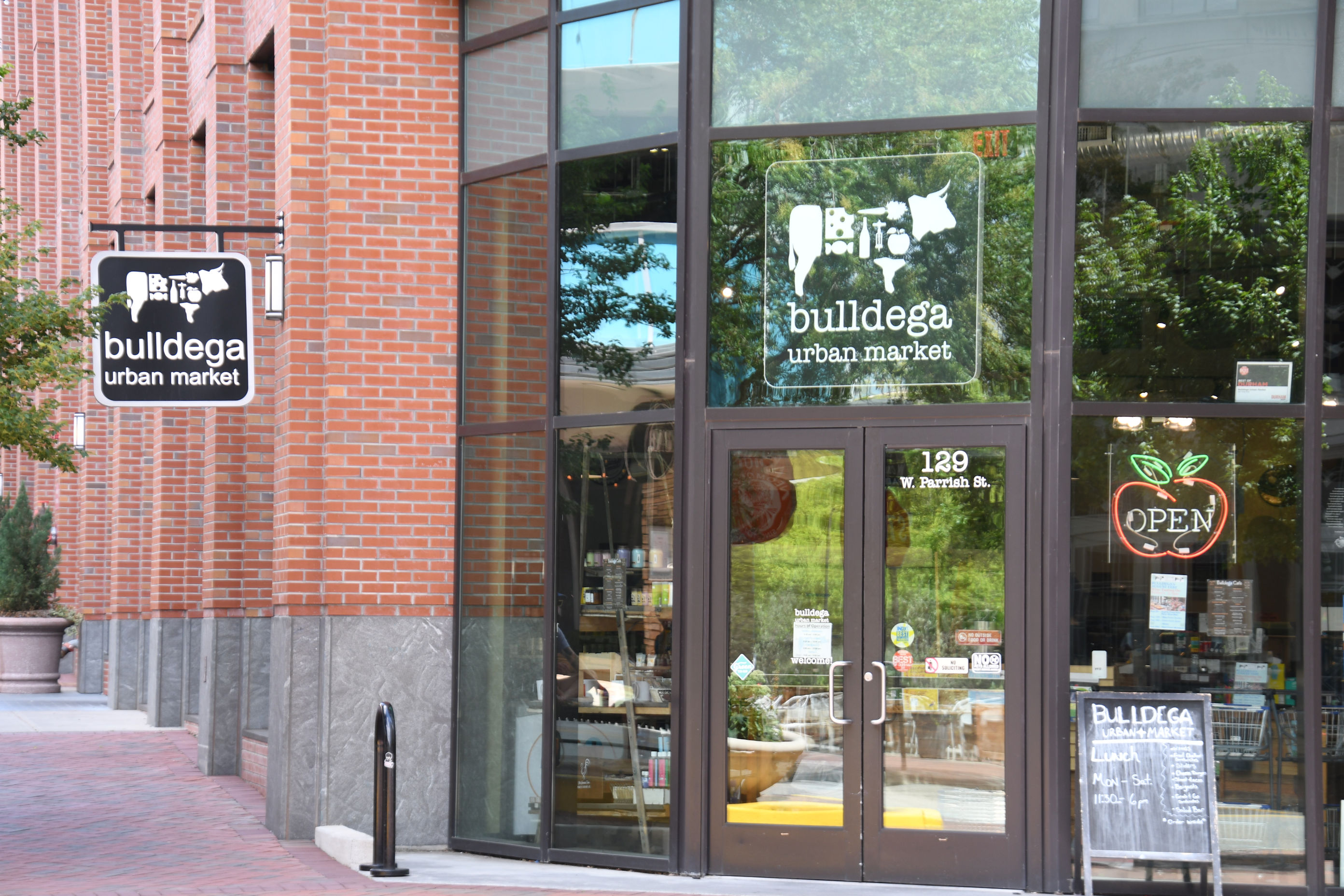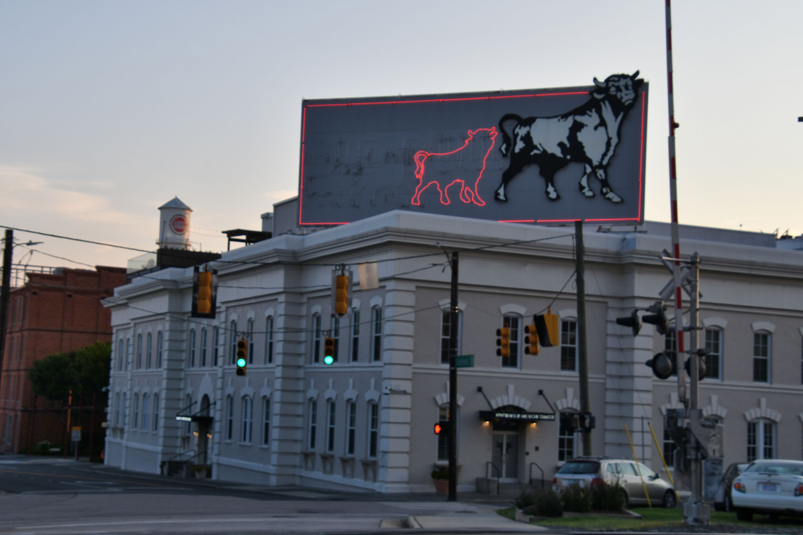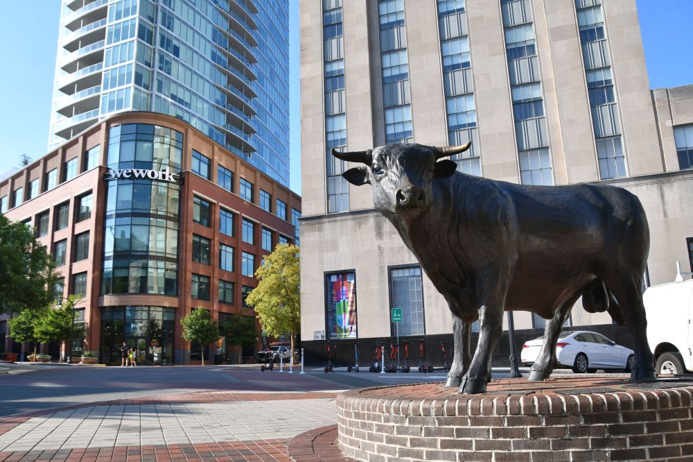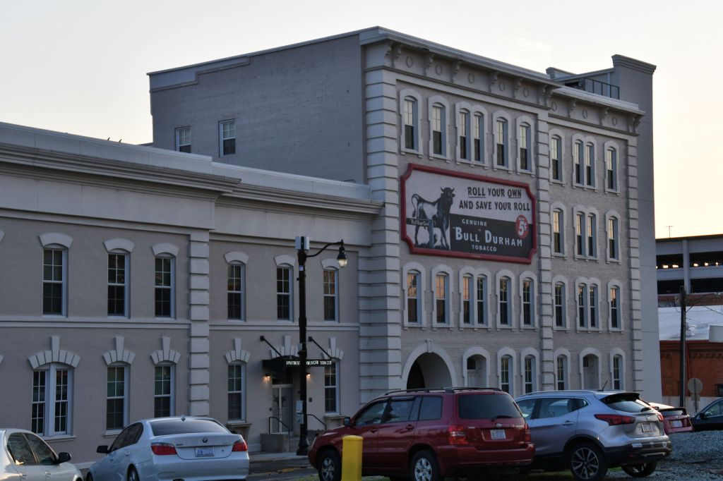 Pedro and I have noticed, having spent a couple of days in Durham at this point, that the bull theme is prominent. There is bull art, bull puns, our hotel is decorated with bulls. There is Bull City Ciderworks and Bull City Running Company. In that corner building you see above, beneath the wework sign, is the Bulldega market.