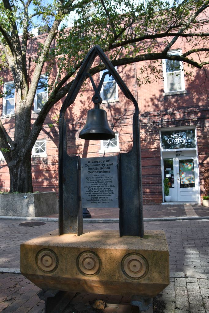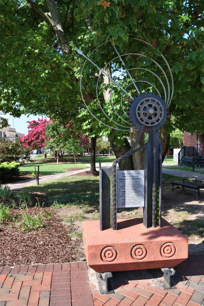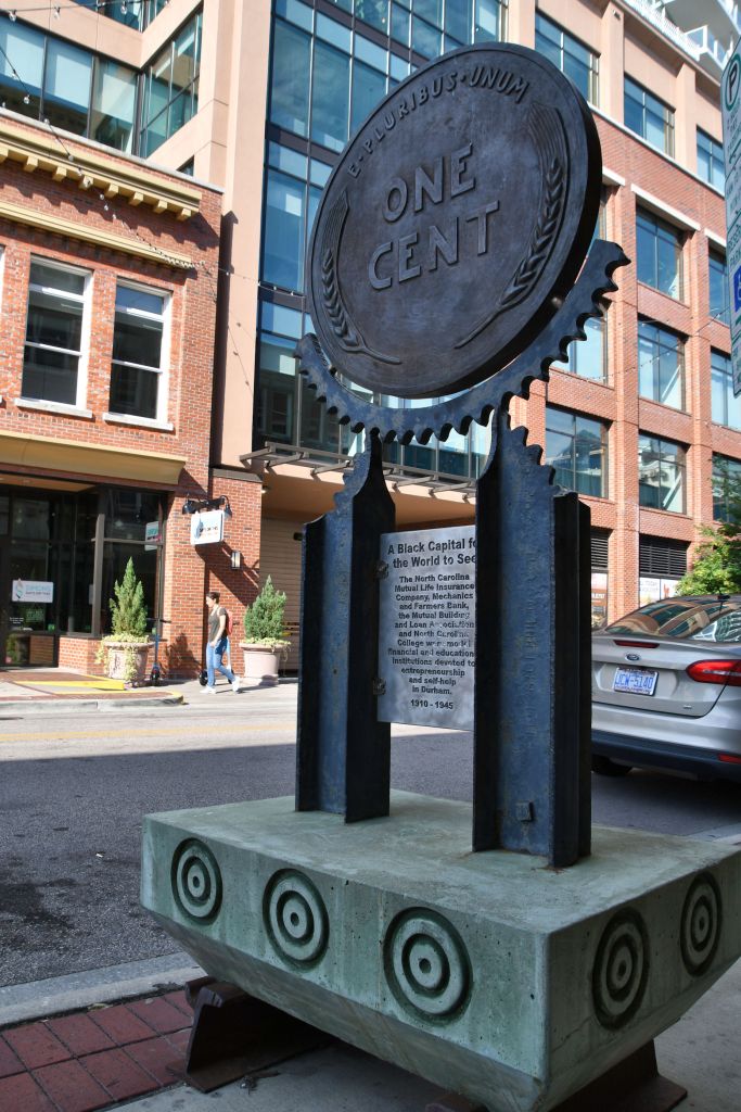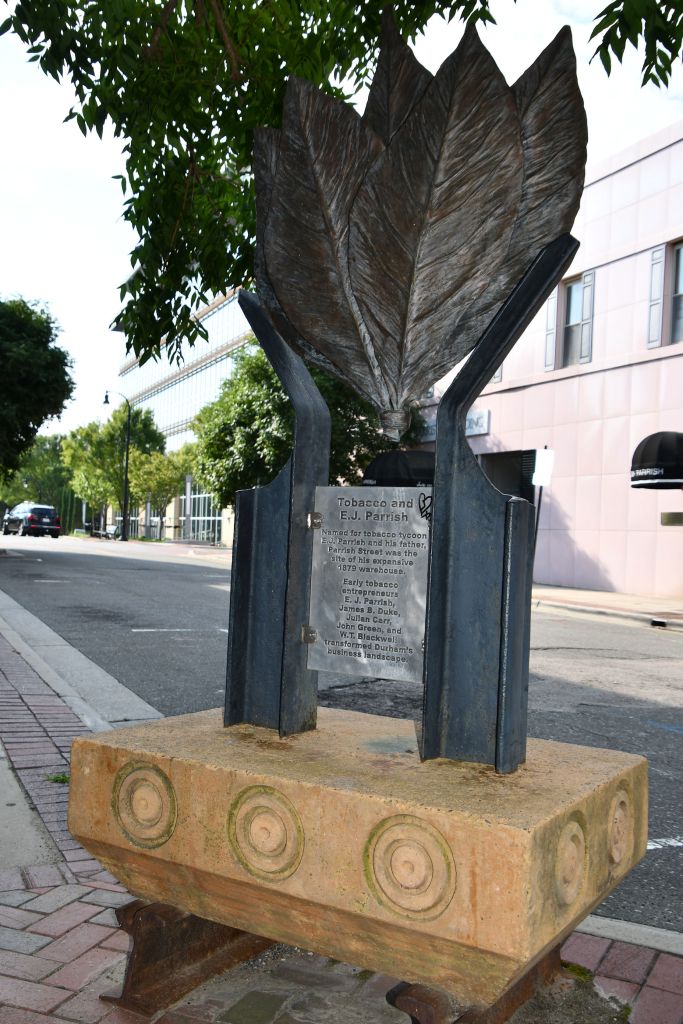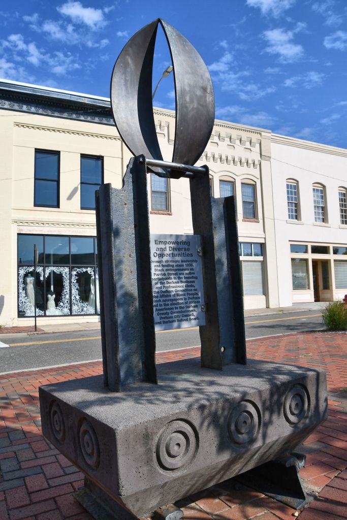 If you wanted to read the engraved plaques in the photos, you’ll see that they all tell the story of Durham’s economic history. Captions talk about Black leaders in business, Black entrepreneurship, Black community and institutional cornerstones, small business focus and support for African American business owners, funding for Black business owners, and the tobacco entrepreneur E.J. Parrish, for whom this street was named, that became an economic center. Naturally, with all that support, the Black economy thrived here, and got the nickname Black Wall Street. This was not the one you have heard about in Tulsa, Oklahoma, that threatened White business owners so much that they burned it to the ground.