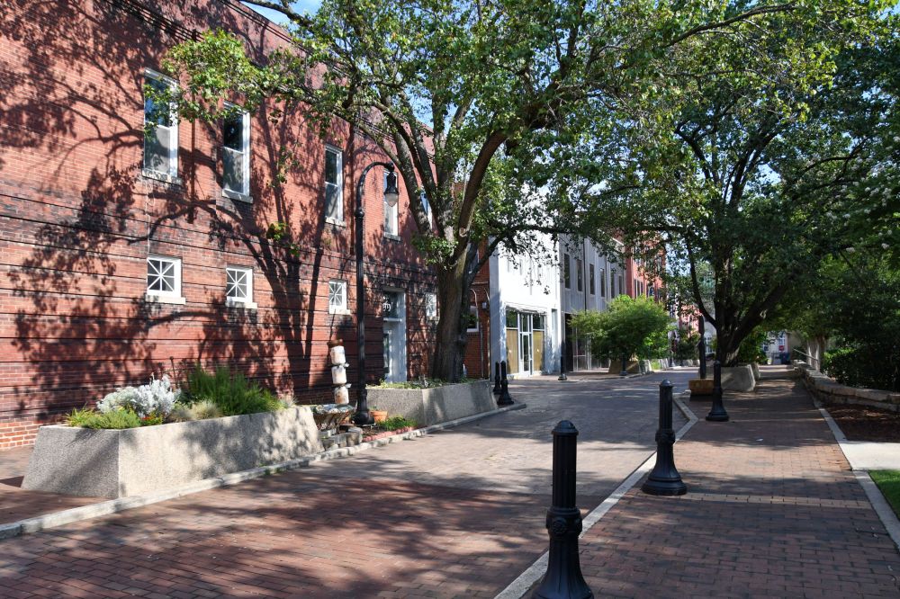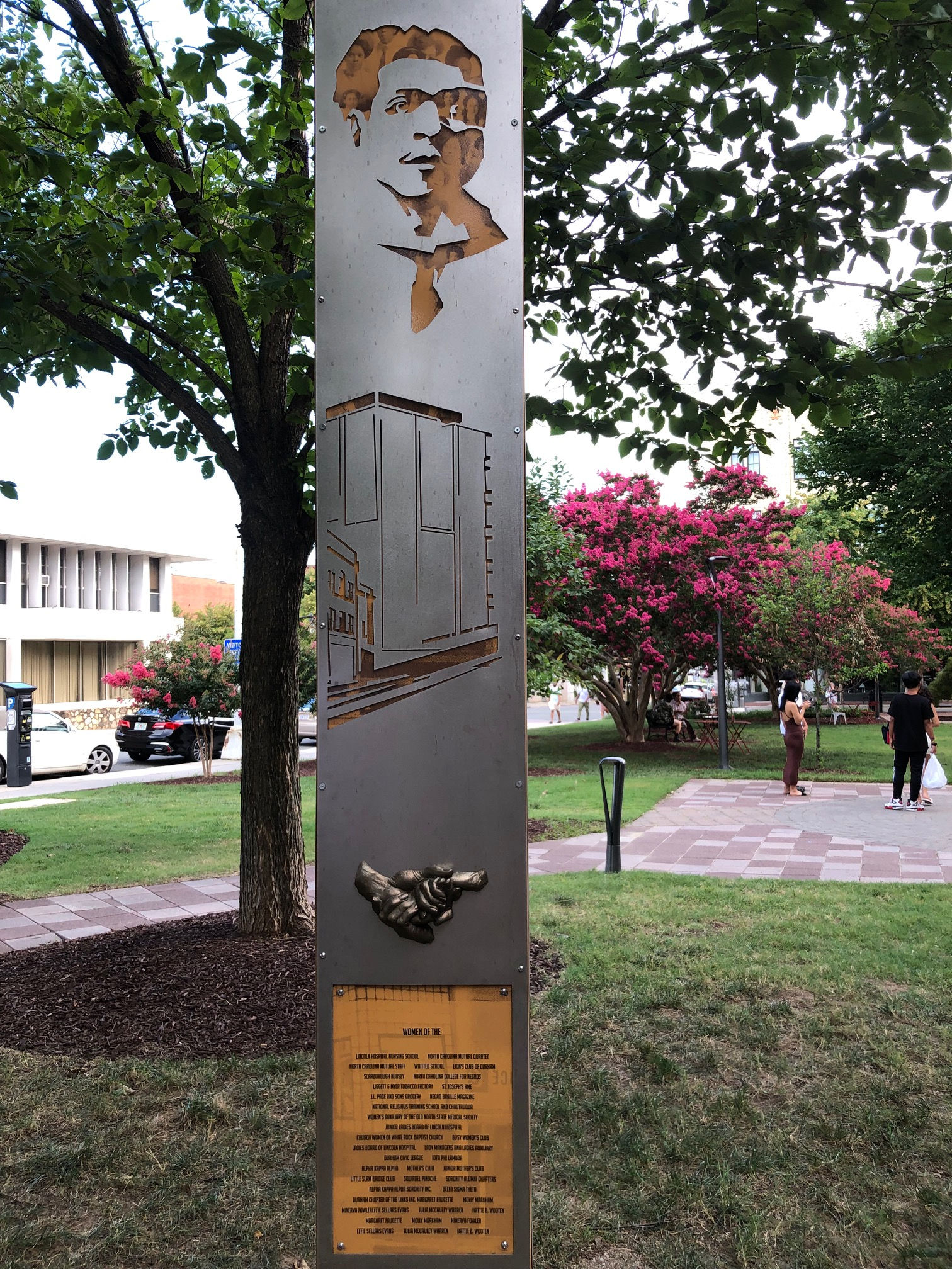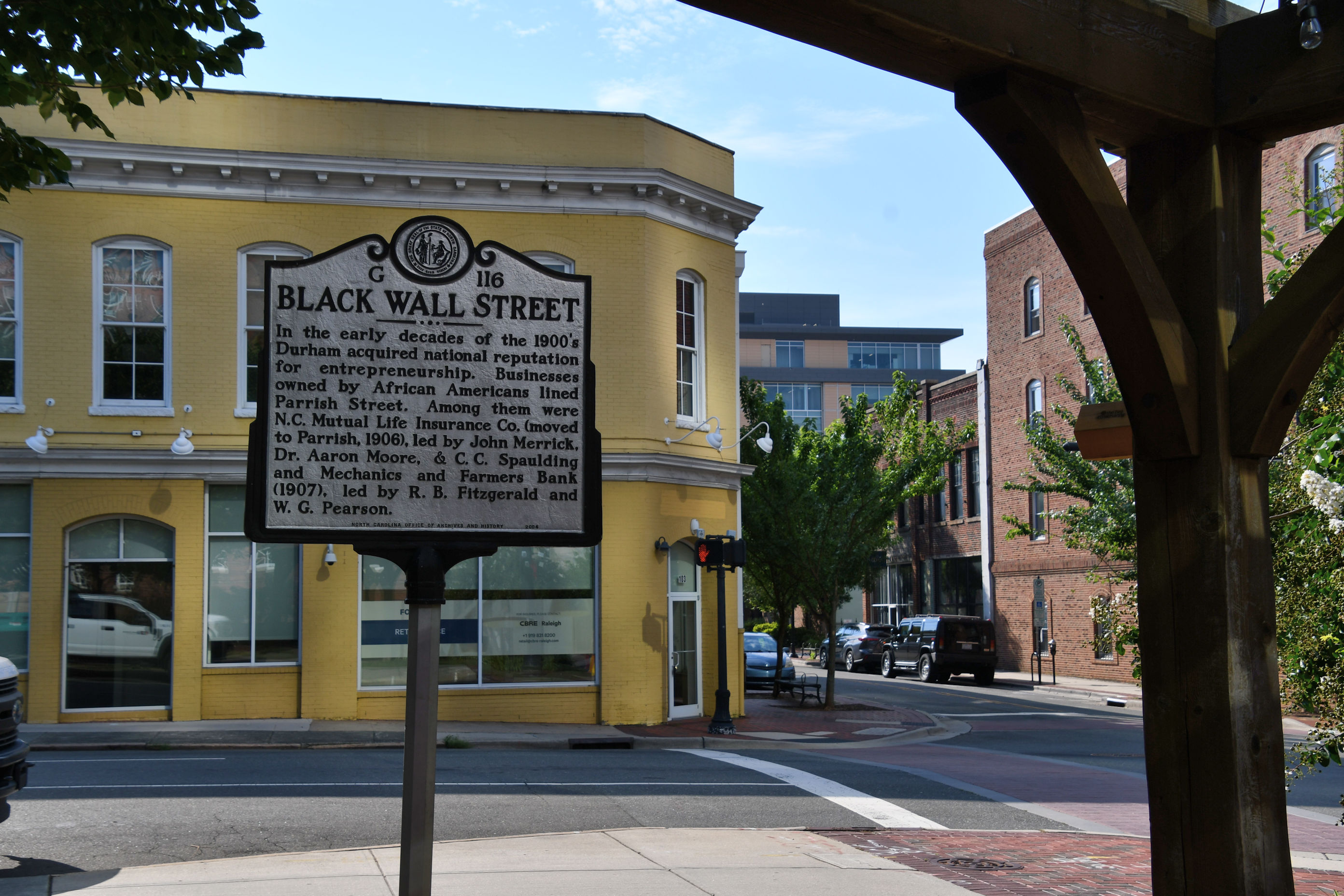 If you wanted to read the engraved plaques in the photos, you’ll see that they all tell the story of Durham’s economic history. Captions talk about Black leaders in business, Black entrepreneurship, Black community and institutional cornerstones, small business focus and support for African American business owners, funding for Black business owners, and the tobacco entrepreneur E.J. Parrish, for whom this street was named, that became an economic center. Naturally, with all that support, the Black economy thrived here, and got the nickname Black Wall Street. This was not the one you have heard about in Tulsa, Oklahoma, that threatened White business owners so much that they burned it to the ground.