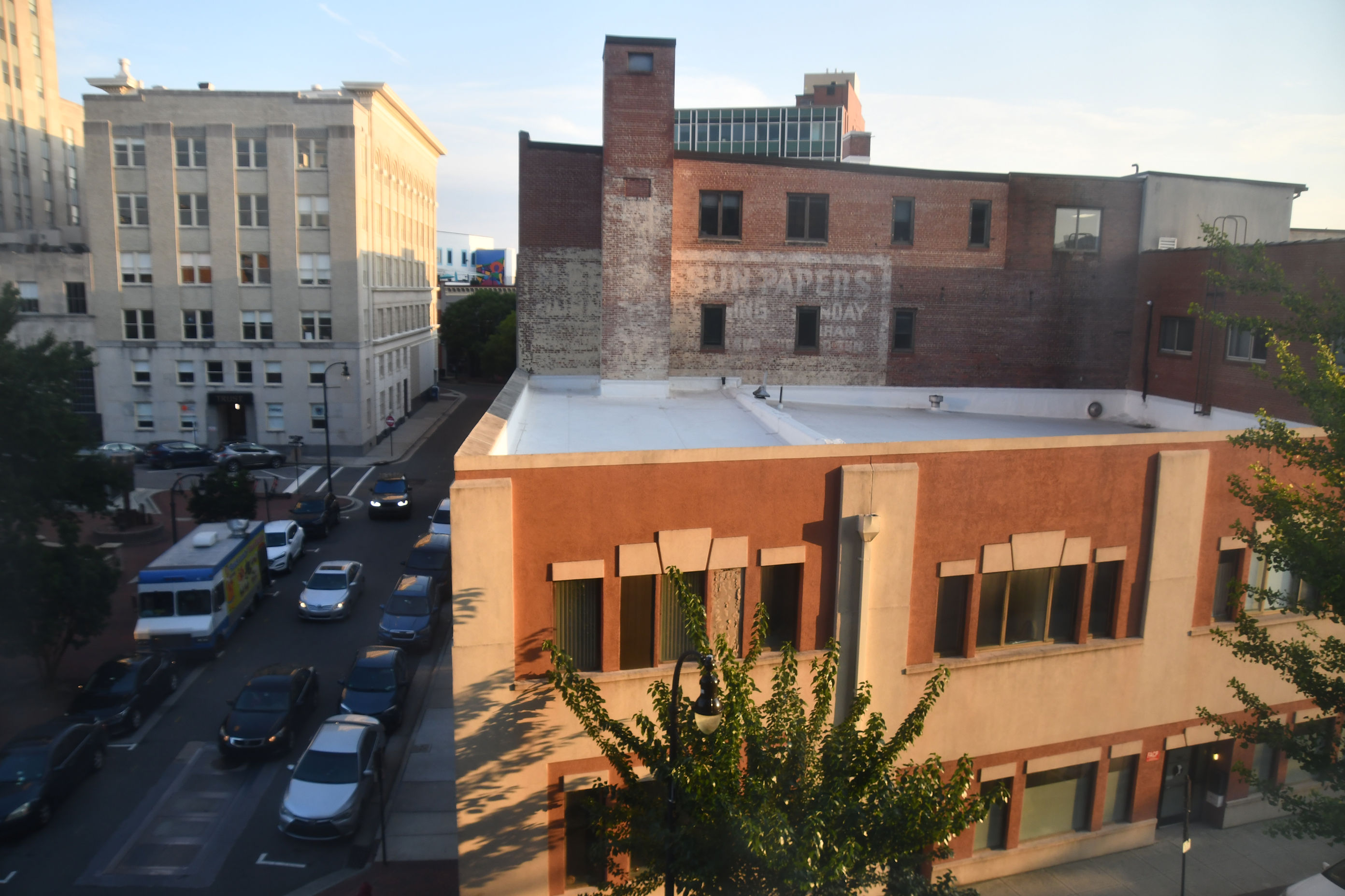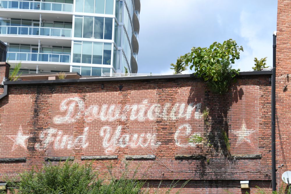 The view out our hotel window showed some faded wall art. I don’t know why I love these old advertisements so much, but I do. Do you see the mural in the distance?I zoomed in to the scene above, and found another hidden piece of art. I never did spot her from the ground, but it was fun to see her from up above.