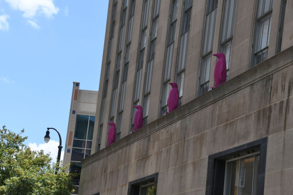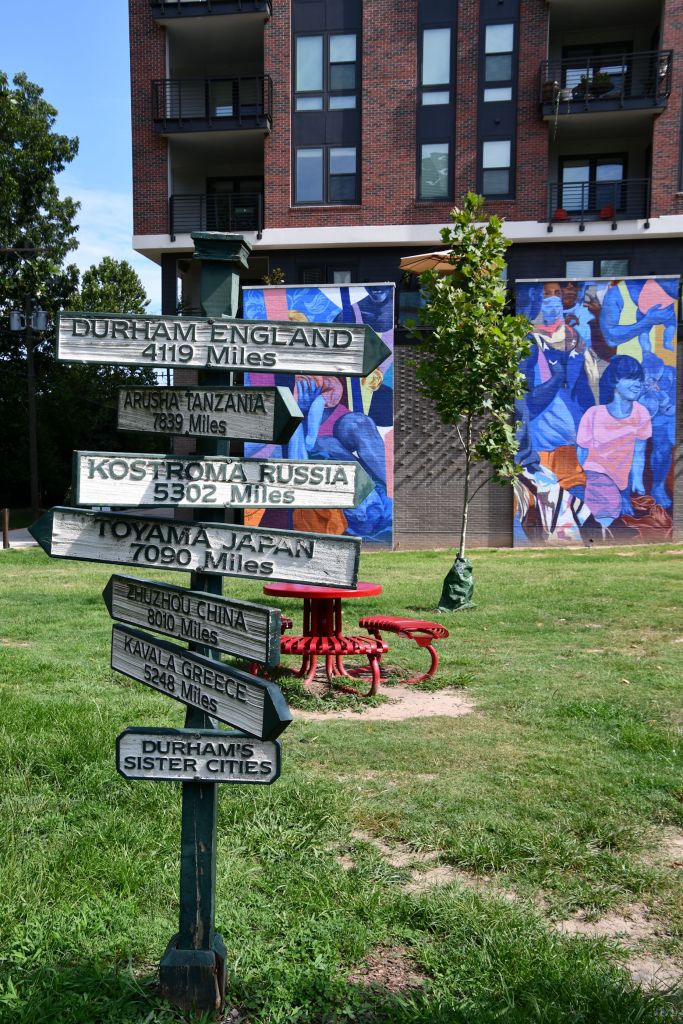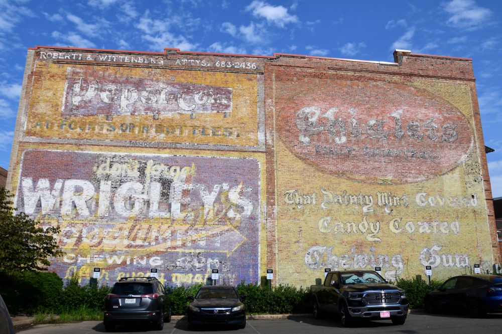In this location, the old wall was left standing, but newly constructed apartments grew next to this courtyard.I walked around the crane and got a better look.These large, beautiful paintings were on an apartment building next to a park.And in the park was this fun sign with all of Durham’s sister cities.I admired these so much. On the right, at the top, it says “DRINK LEMON KOLA.” But I could not decipher this one. “Downtown. Find Your Ca–?” Find your car? Your cake? Your corn?I liked these colourful penguins, and……their cousins up above.This was probably my favourite wall of the entire trip. Pepsi Co., Wrigley’s, and Chiclets – three iconic American companies. I love how you can get your drink “At founts, or in bottles.”
