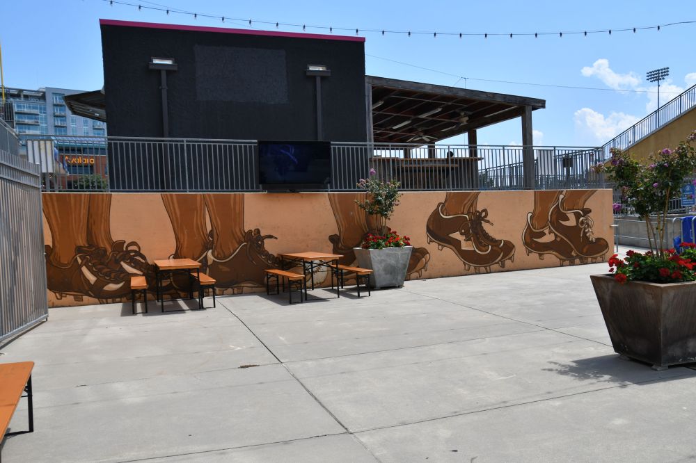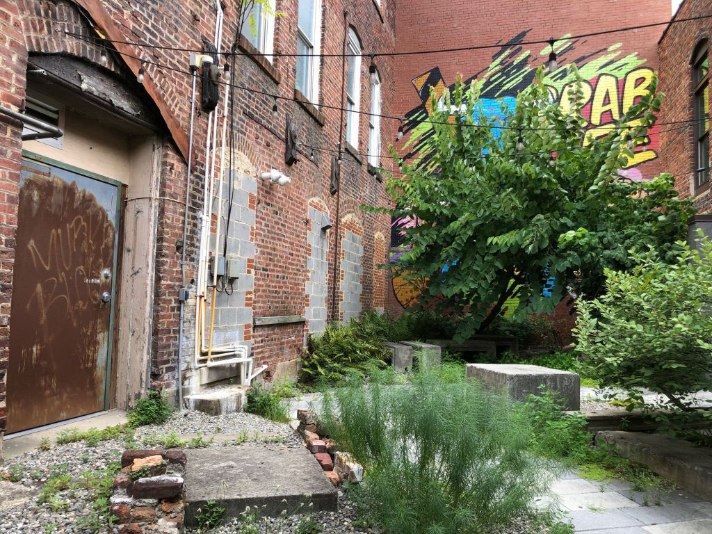 This brick facade has been saved, and there is a mural on the inside, as you can see below.