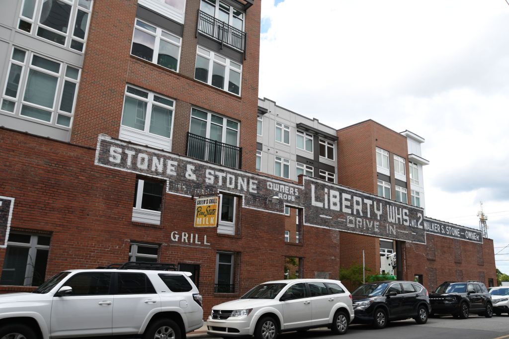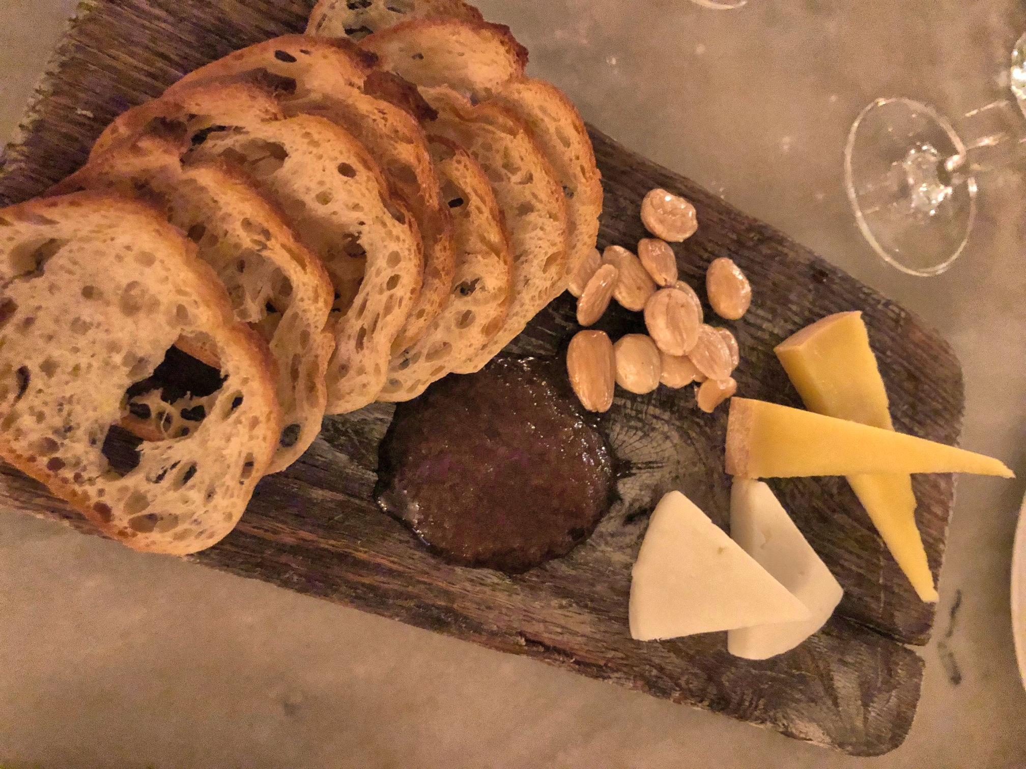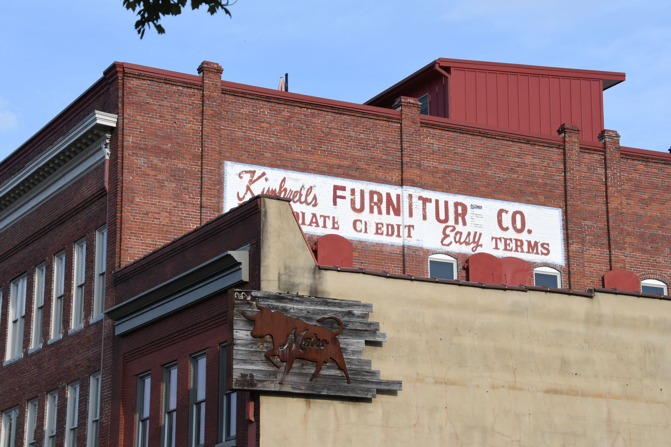 This mural was a destination located in the booklet. Good thing for the photo in the booklet or I might not have noticed it is another Durham bull.Can’t have too many bulls.I was heading for the mural, but got distracted by this curious piece of outdoor art. The marble block in the center is engraved “All the possibilities of stacking up to two3 to sit on.” I searched for a while, but could not find any information about the artist or the inspiration.Durham Civil Rights Mural on the site of the Durham Arts Council. Artist Brenda Miller Holmes worked with Dr. Benjamin Speller, and organized 30 community members to paint this mural in 2013.Above Mateo is an ad for Kimbrells Furniture Co. I made a note of this spot when I passed, and then when Pedro was done with his conference for the day, I brought him back to Mateo.Inside Mateo. We ordered seafood, tuna, squash, pork, and for dessert: cheeses and cheesecake. And wine, naturally.