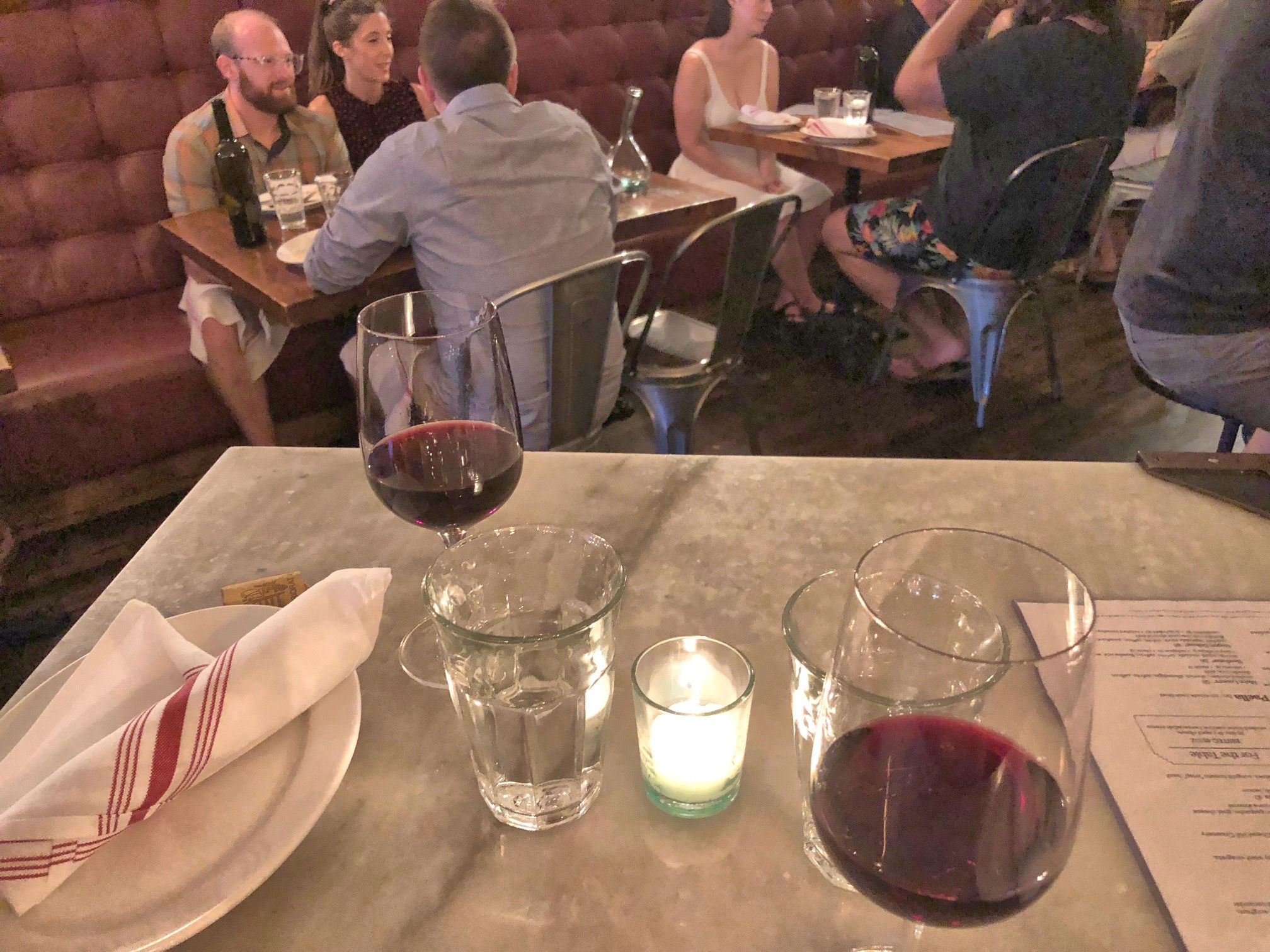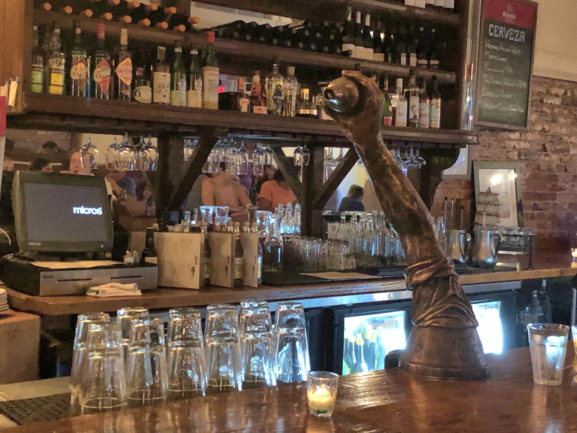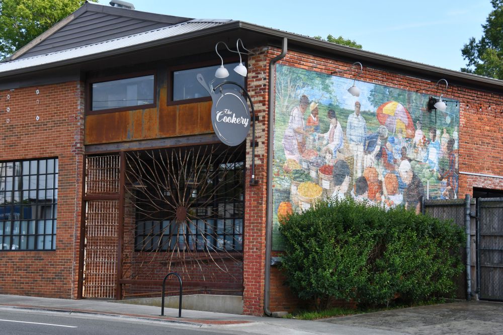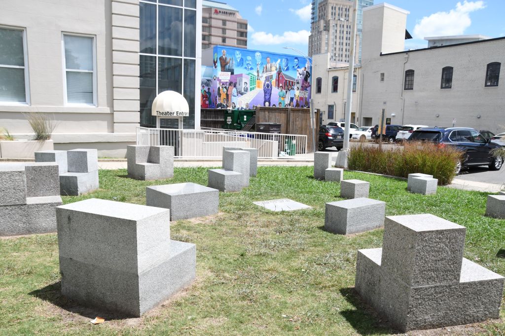 This mural was a destination located in the booklet. Good thing for the photo in the booklet or I might not have noticed it is another Durham bull.Can’t have too many bulls.I was heading for the mural, but got distracted by this curious piece of outdoor art. The marble block in the center is engraved “All the possibilities of stacking up to two3 to sit on.” I searched for a while, but could not find any information about the artist or the inspiration.Durham Civil Rights Mural on the site of the Durham Arts Council. Artist Brenda Miller Holmes worked with Dr. Benjamin Speller, and organized 30 community members to paint this mural in 2013.Above Mateo is an ad for Kimbrells Furniture Co. I made a note of this spot when I passed, and then when Pedro was done with his conference for the day, I brought him back to Mateo.Inside Mateo. We ordered seafood, tuna, squash, pork, and for dessert: cheeses and cheesecake. And wine, naturally.