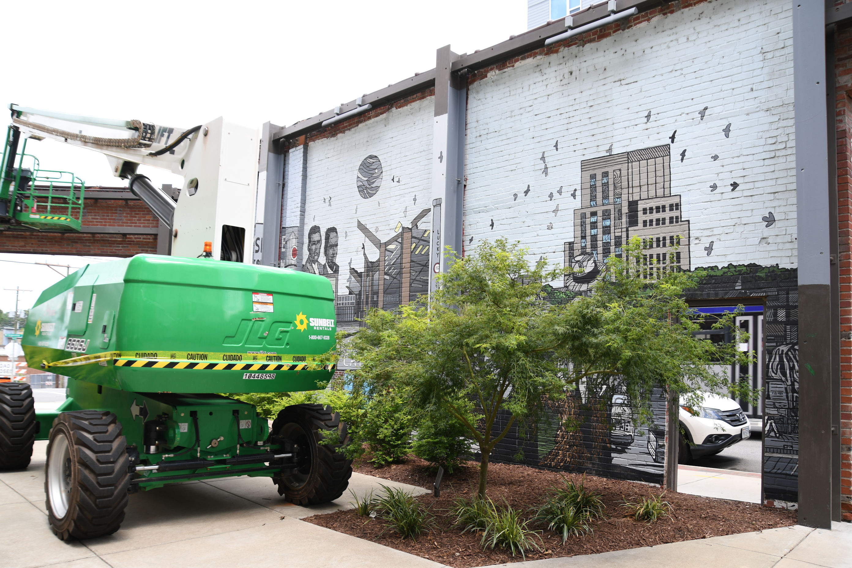 Alright, one vote for Car. I found the mural and the crane entirely by accident. One cannot tell from the outside of the brick facade what is on the inside. I only walked into the courtyard because of a sign that seemed funny to me. I walked in and took a photo, then when I turned around to leave, I found this huge, beautiful mural! Albeit hidden behind a crane and some trees.