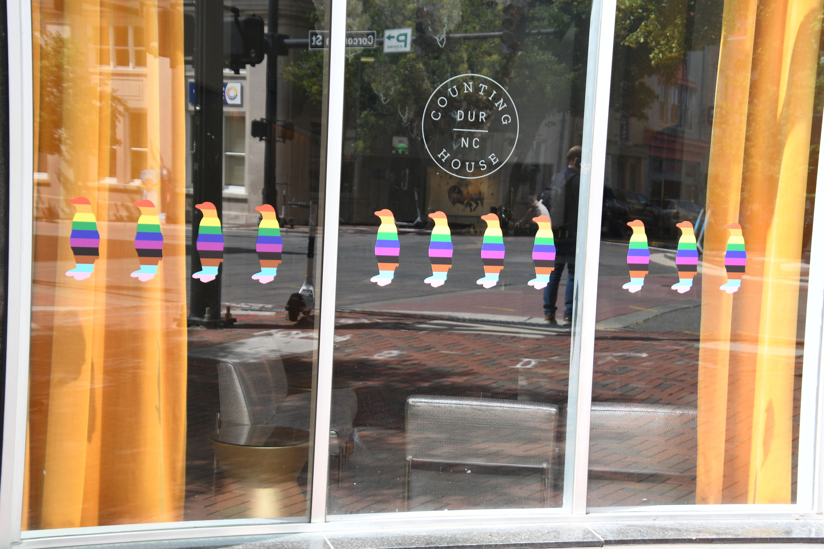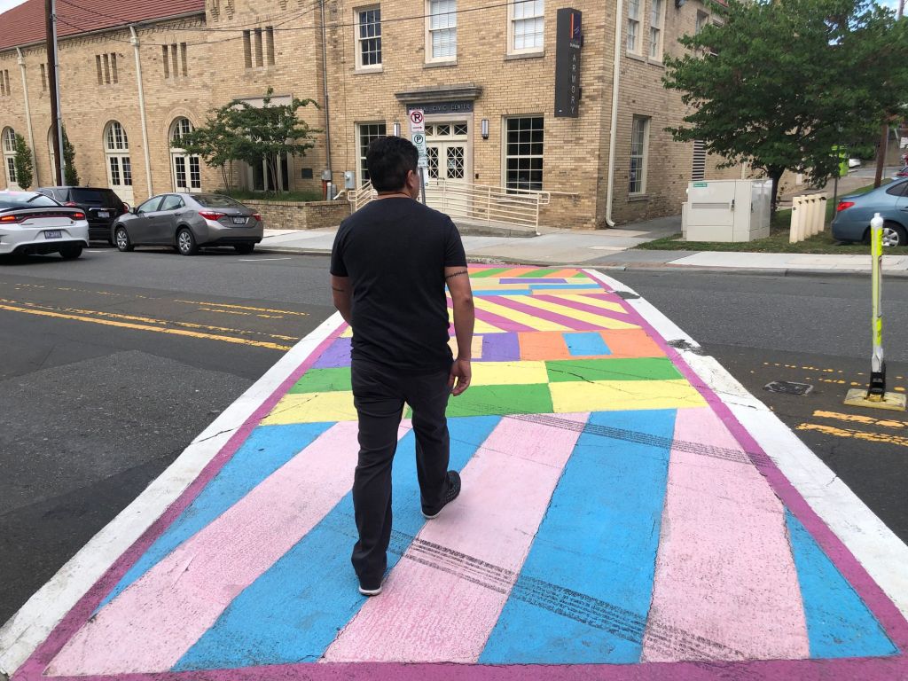Pedro crosses one of the brightly painted crosswalks in Durham.