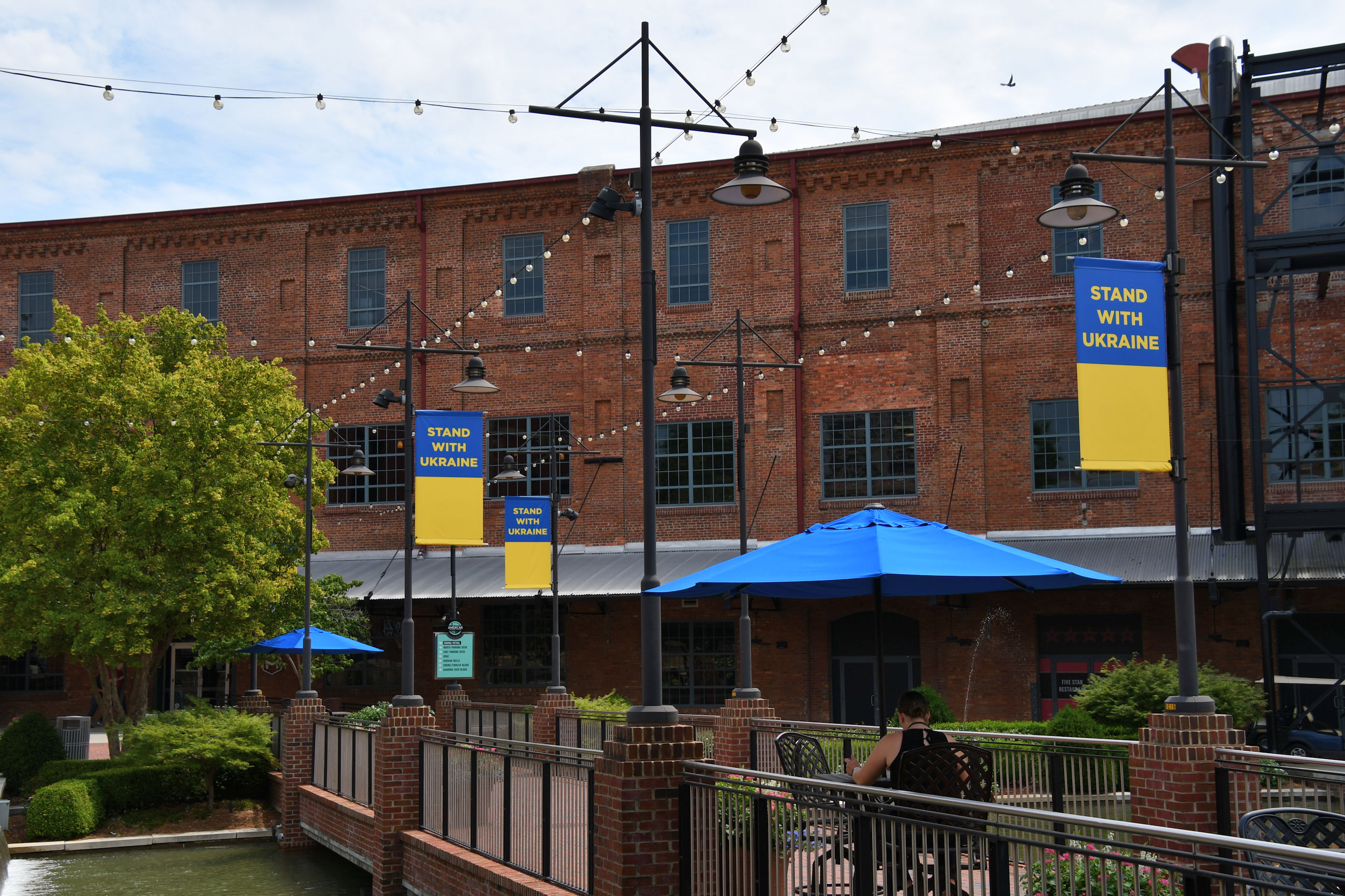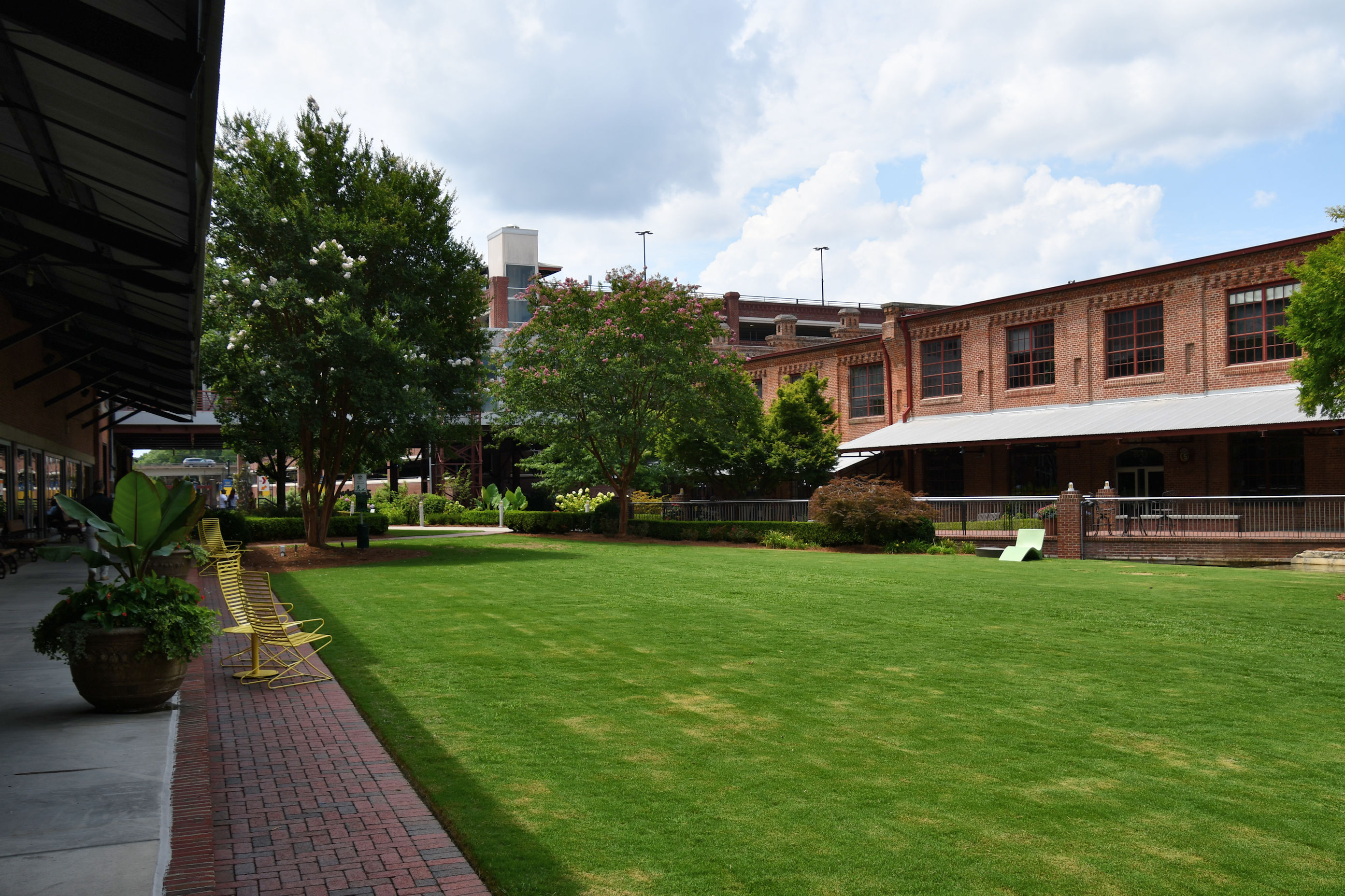 There are multiple entry points, and once you’re on the campus, it’s a long rectangle bound by old manufacturing buildings, with a central courtyard area that is very inviting from end to end. The lawns are beautiful and there are multiple places with seats and trees and umbrellas for shade. There are also a few public art pieces to enjoy.