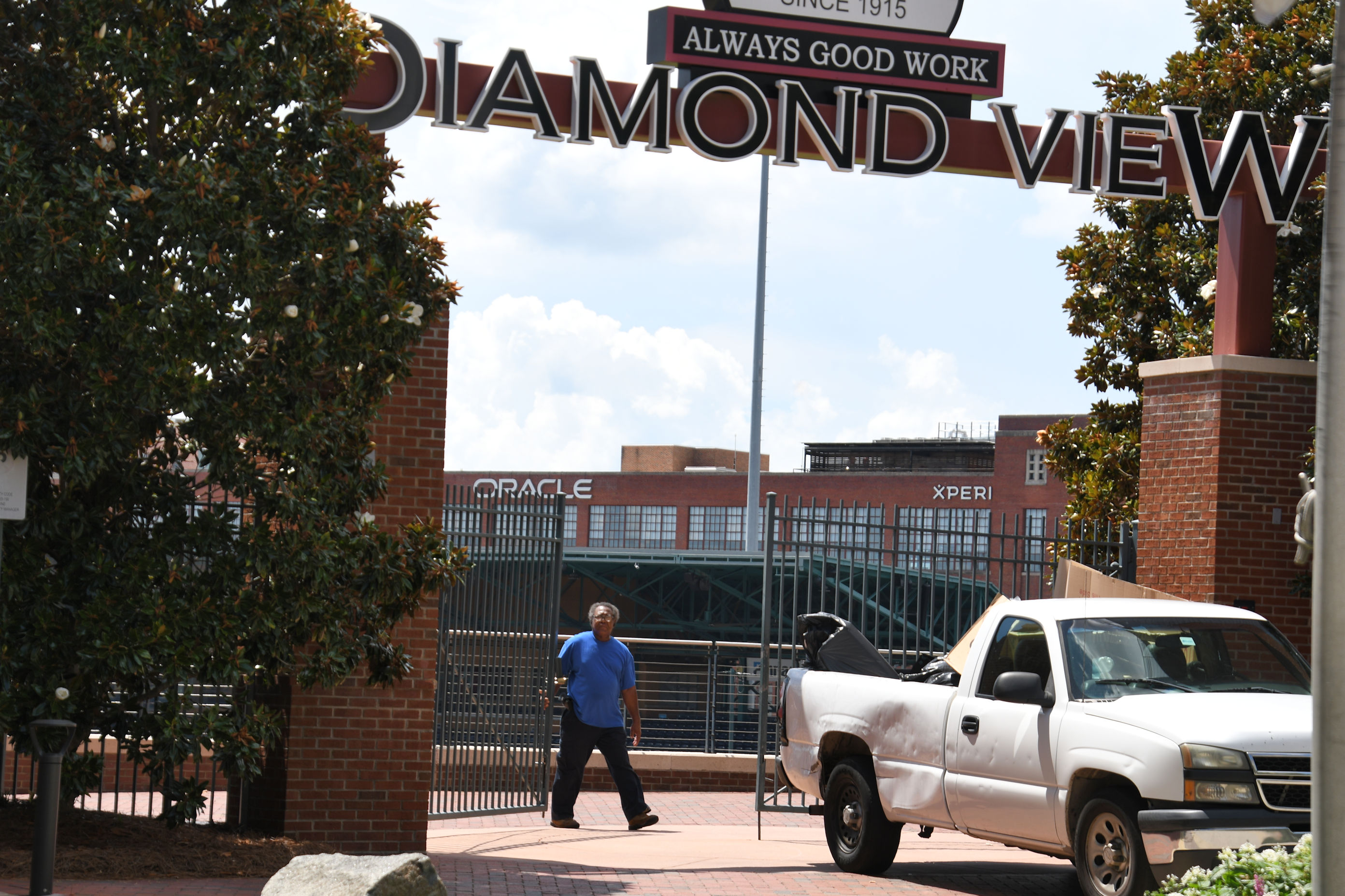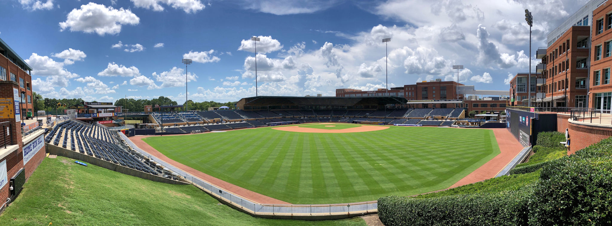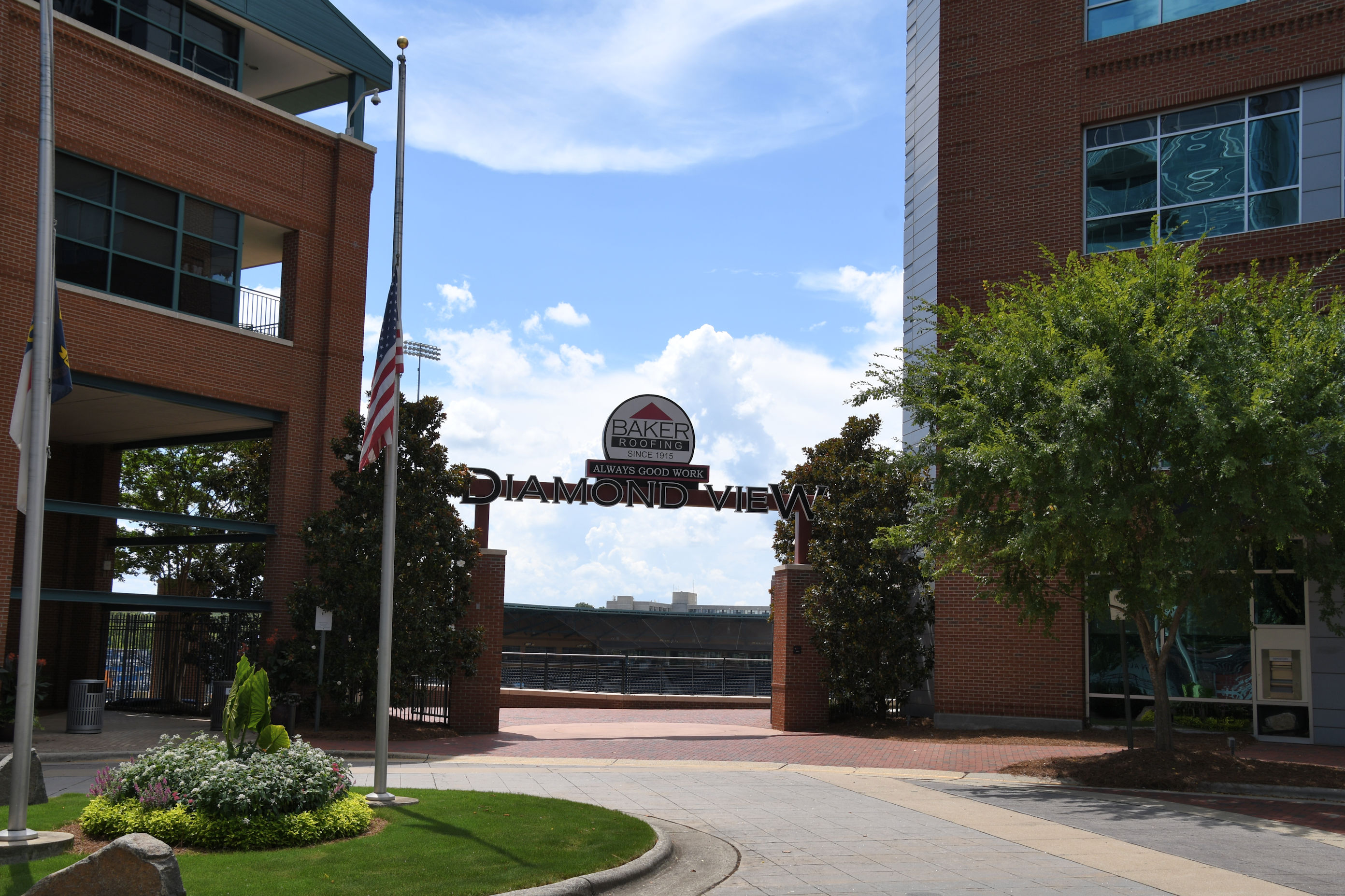 Across Blackwell Street, west of the campus is the Durham Bulls athletic park. The front entrance is beautiful, and I included a night photo of it in an earlier post. On my last day in town, I went to the other side to see if I could get a look at the playing field. I arrived to find the gates wide open. I walked right in and took photos.