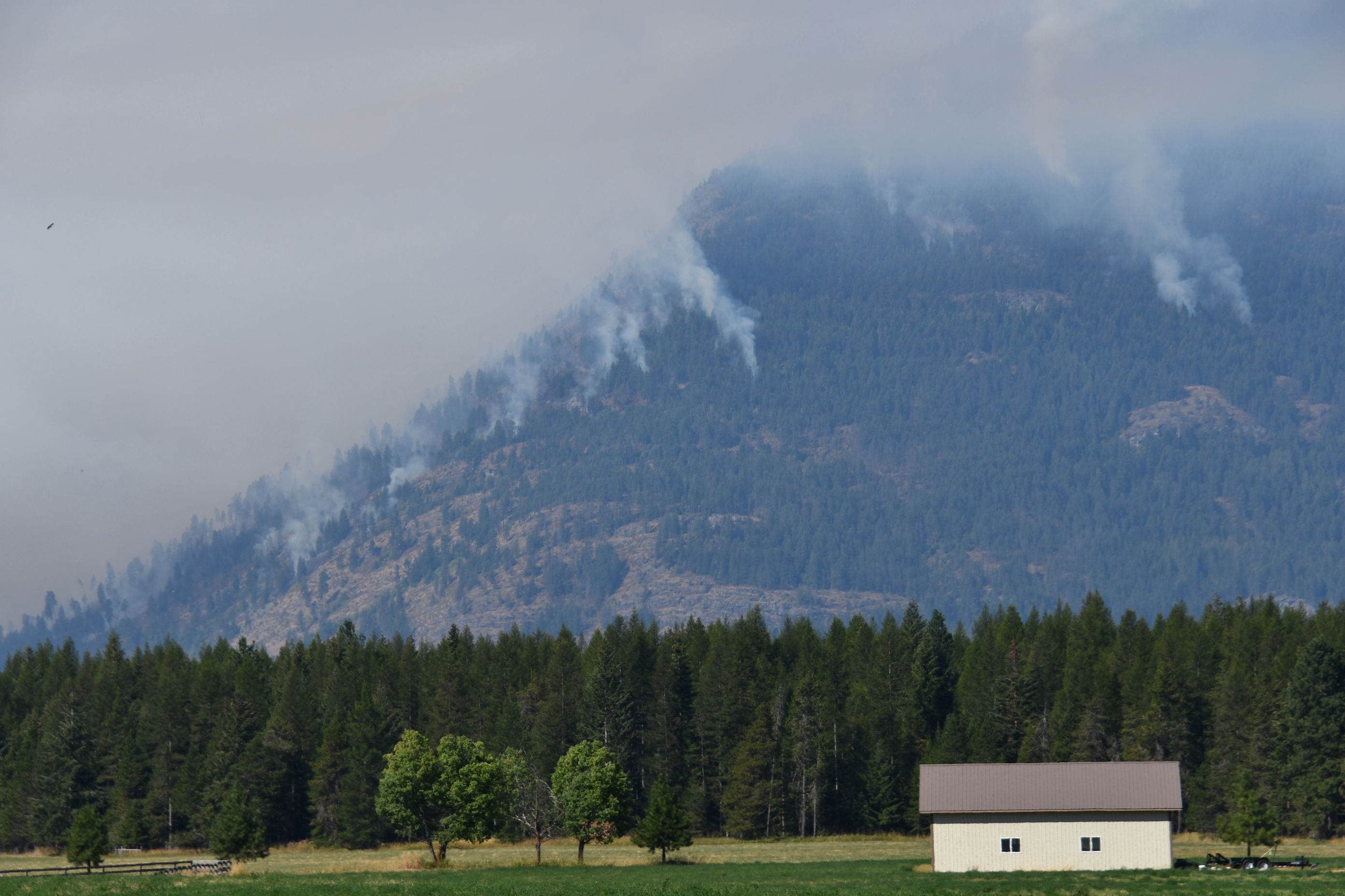 Before we left our country, we got up close and personal with the fire. The Kootenai River Complex in North Idaho had grown to 10,000 acres at the time. (It’s 21,000 today) We could see many different plumes of fire showing places where the fire was burning heartily. It was clear that the fire was spreading across different hillsides on steep slopes in multiple directions. In order to fight it, people would have to be all over the place. Jim had said they weren’t fighting it at the time though because the hillsides were so steep that it would be too dangerous for firefighters to attempt to get in there. They were mostly keeping an eye on where the hot spots were approaching buildings. We could see that the chance of fire burning someone’s home or barn was a very real threat.