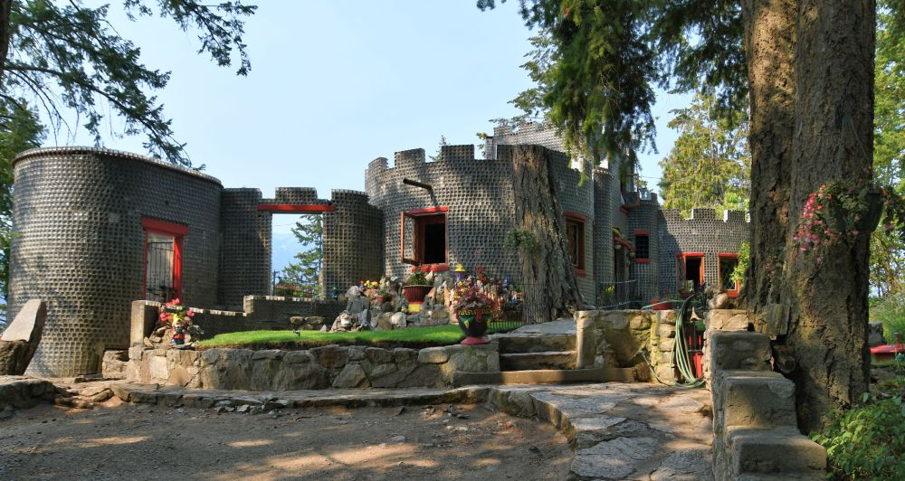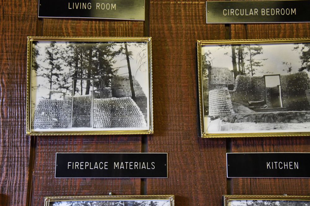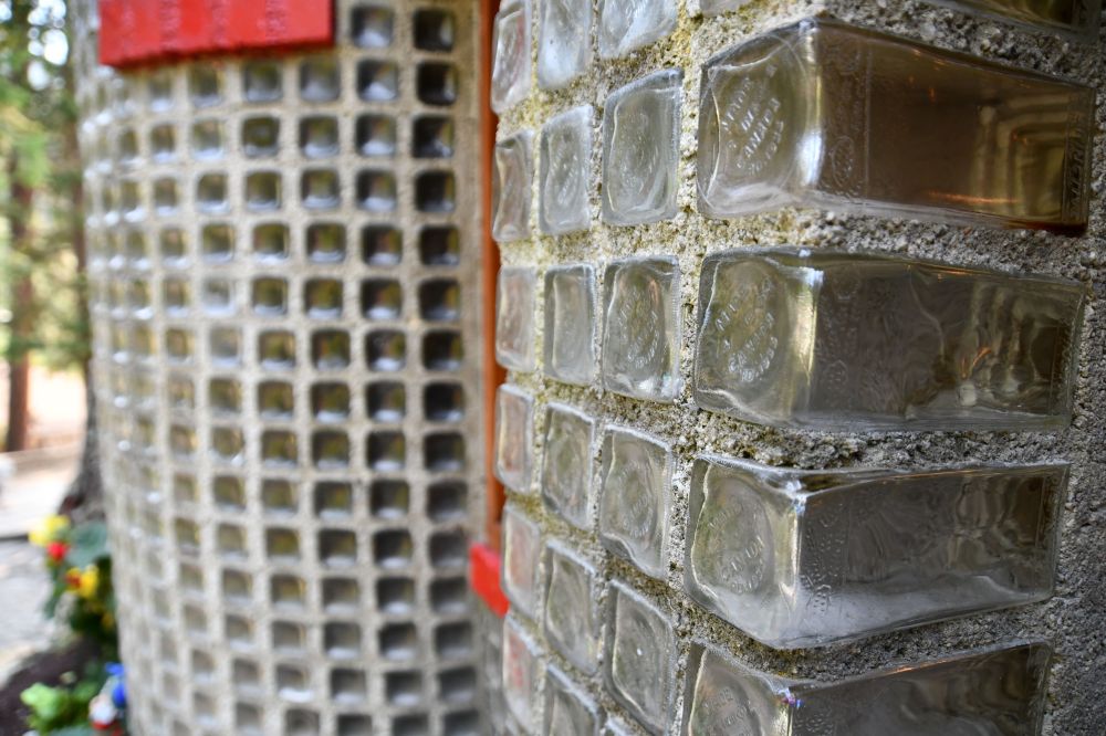 Back in the 1940s, recycling had not yet become widespread, but David H. Brown was bothered by the amount of wasted bottles in the course of his mortuary services. It took two to four bottles of embalming fluid per person, and they quickly piled up. The bottles holding embalming fluid were made of thick glass and had a square shape and a short neck and he got to thinking that this was a good shape to use for some kind of building material. He mixed cement and began experimenting. He also contacted his mortuary friends and acquaintances across Alberta and British Columbia and asked them to save their bottles for him. He continued to perfect his technique and found that the bottles work well for insulation. He and his wife bought a beautiful piece of land on the shore of Kootenay Lake and decided that he would build them a home out of embalming bottles.