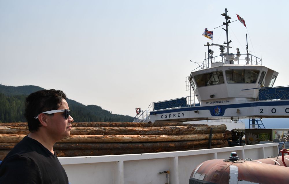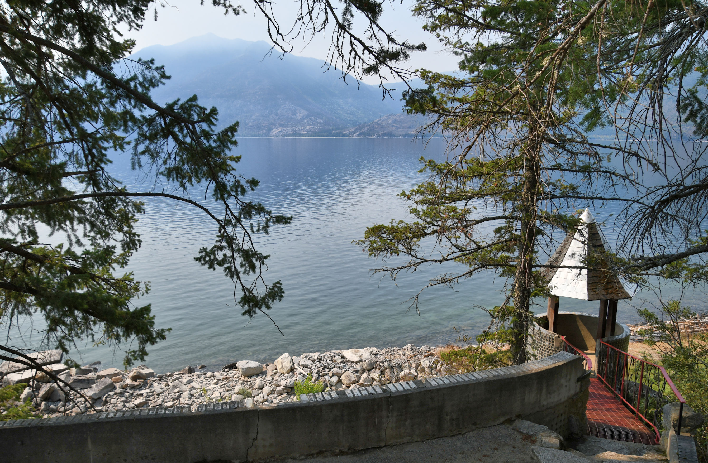 Despite the smoke in the air, that grew thicker as we traveled, it was a beautiful route through gorgeous country. I was sad that Pedro was not getting the full experience of stunning British Columbia, because half of our vistas were obscured. We stopped for a break at a rest area co-located with a marina, and though the smoke hung low, it was still pretty and we could still imagine what it could look like on a clearer day.