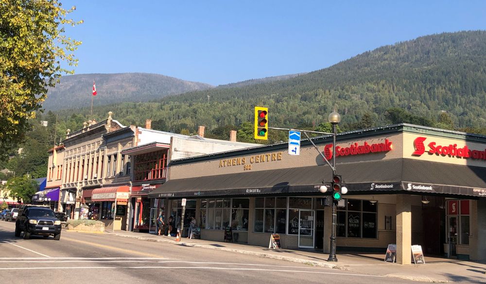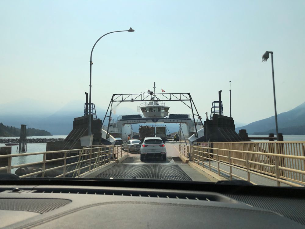 There was almost nothing to do in the area but wait and worry. After an hour, the next ferry to arrive was much larger than the one that we had first seen, and we were so relieved. This ferry was able to accept both log trucks and the 18-wheeler, and all the waiting vehicles. Whew. Off we went again. It was enjoyable to get out of the car and go up onto the deck and let the wind blow through our hair as we traveled across the lake. Sad that our views were again blocked by all the wildfire smoke. Soon we docked and made our way a few more miles to the darling town of Nelson, BC.