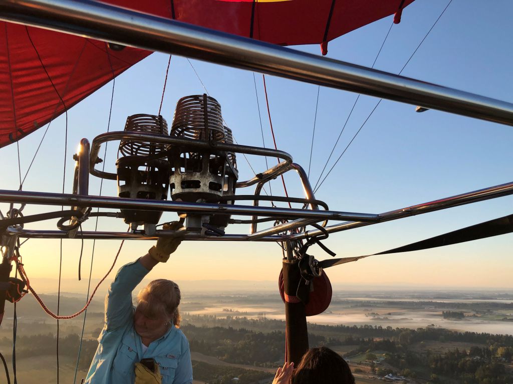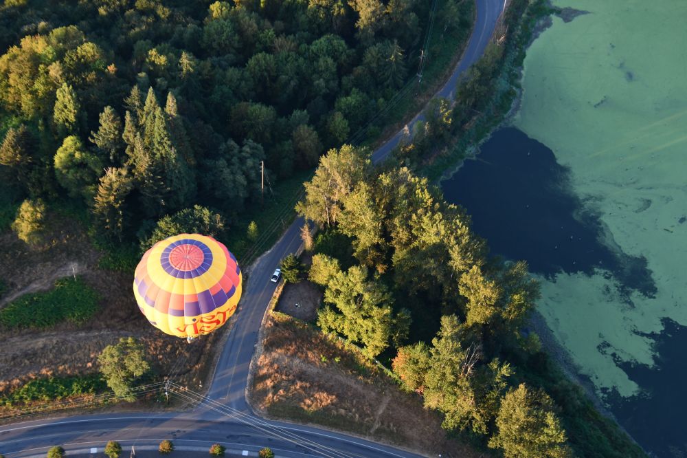 The pilots at Vista Balloon do this neat trick where they set the basket onto the surface of the Willamette River. That’s what is going on in the photo with me and Kellen above. What’s really happening is that the pilots are carefully keeping the balloon basket at the exact level of the surface of the water, because it certainly does not float. Our pilot kept us on the river a long time, waiting for the other balloons to arrive so we could see what it looks like, but they were not able to join us. The one in the photo above couldn’t catch the wind right and finally had to give up and move on.