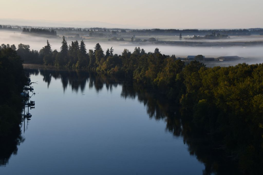 We rose with the sun. In this photo you can see orange smoke from wildfires and on the ground a thin layer of morning fog.
