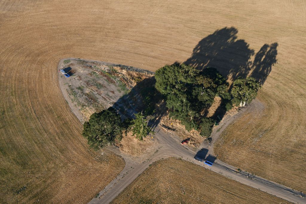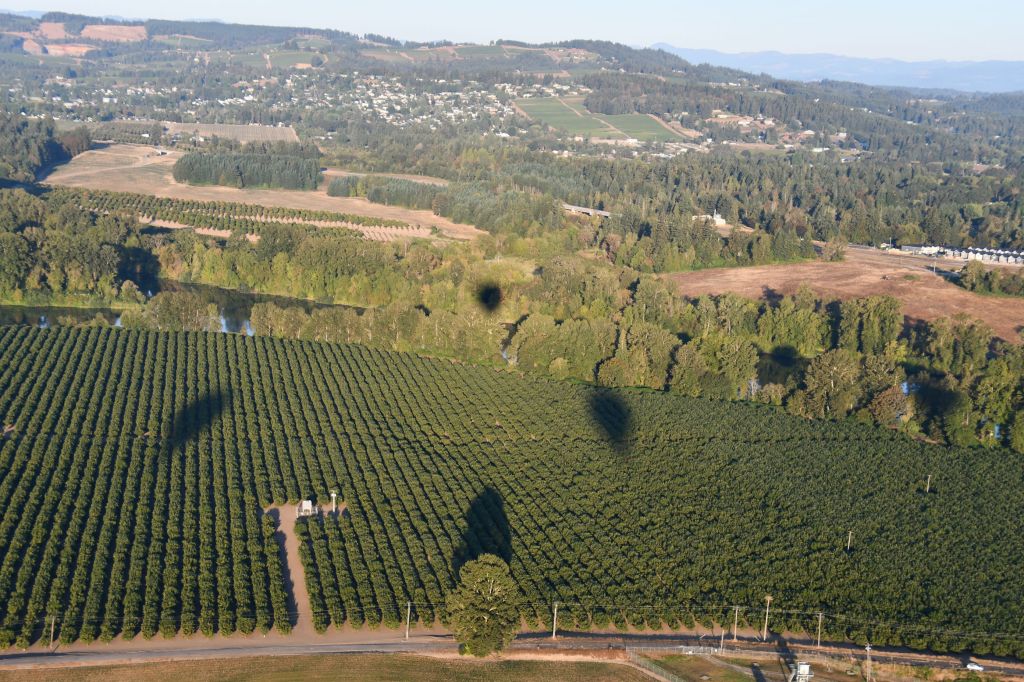 Our shadows over a Hazelnut grove. Hazelnuts are a major Oregon export.