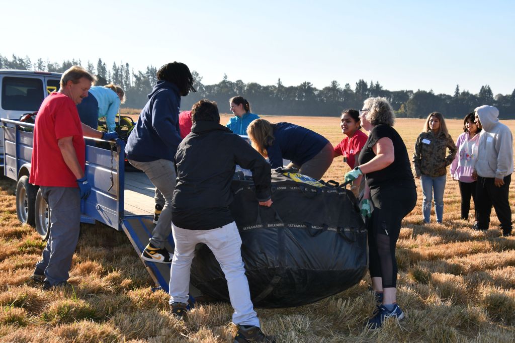 We had a little kid on the flight, and the pilot asked him to climb up on the duffel bag and jump around to squish more air out. Then the bigger people sat on it. Finally we were able to get it closed. Then it had to be lifted and that took a lot of people and coordination. Somebody yelled, “One, two, three, lift!” And with each lift, the bag would scoot a foot. Eventually that was loaded too. The very last thing was to load the basket on, then we closed up the trailer and all climbed into the van for the ride back to the Newberg airport.